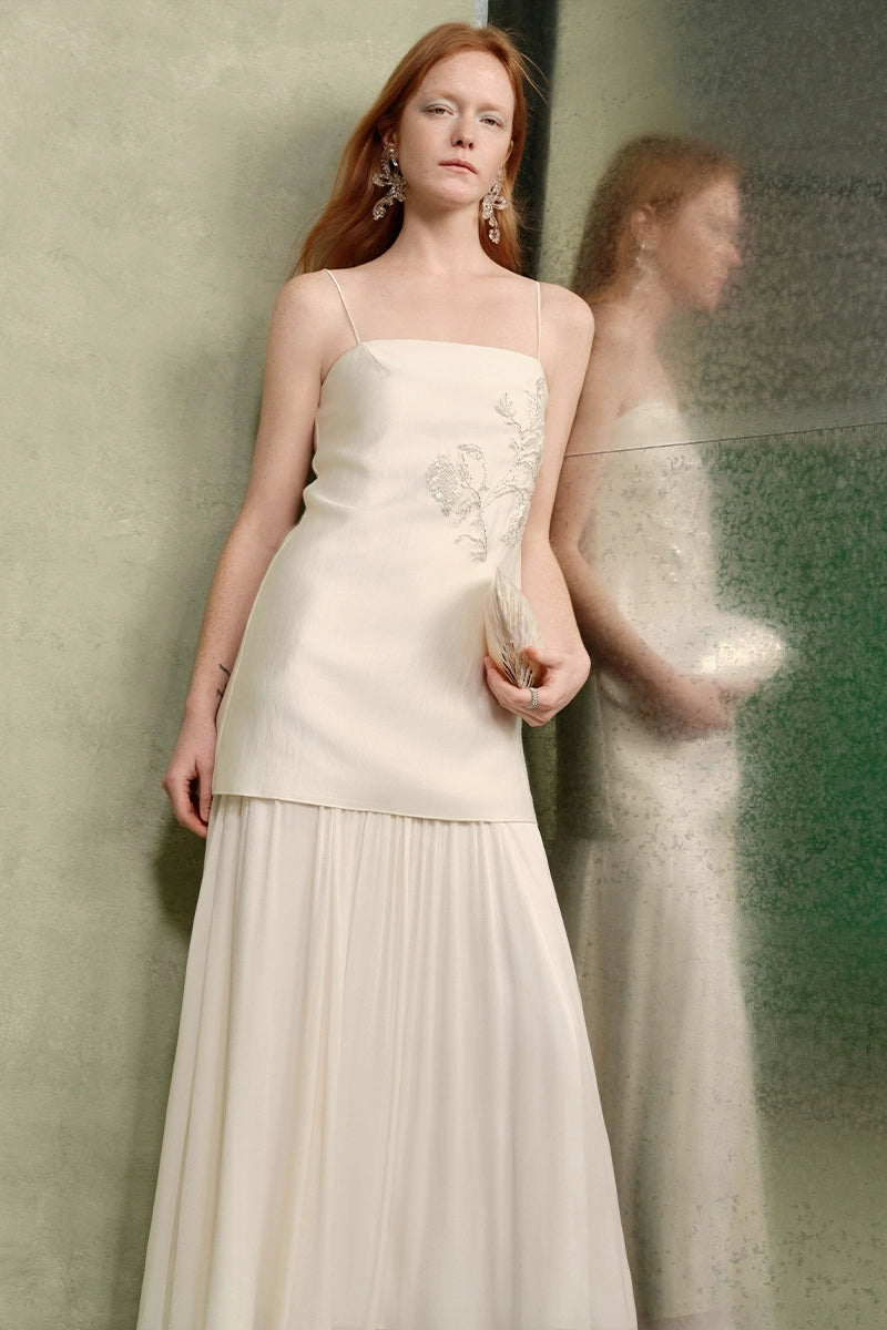 The artistically crafted relief-embroidered mesh skirt has been refined through precise adjustments to the waist...