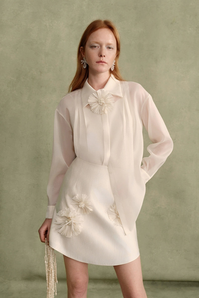 White Handmade Flower Lapel Shirt, Mini Skirt Set