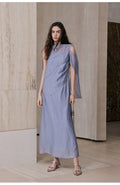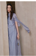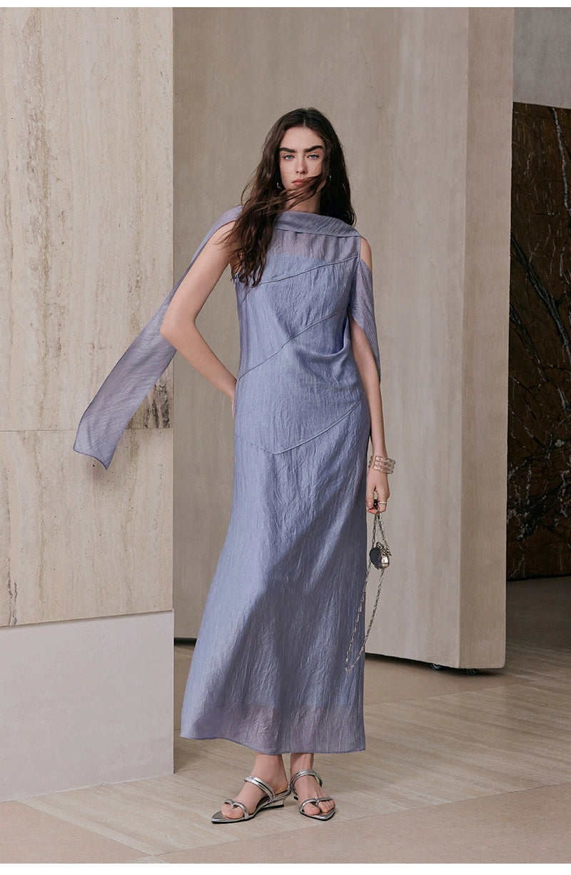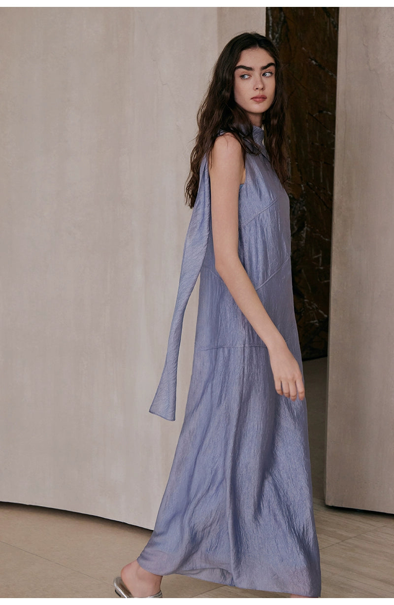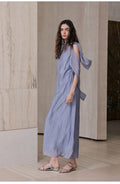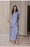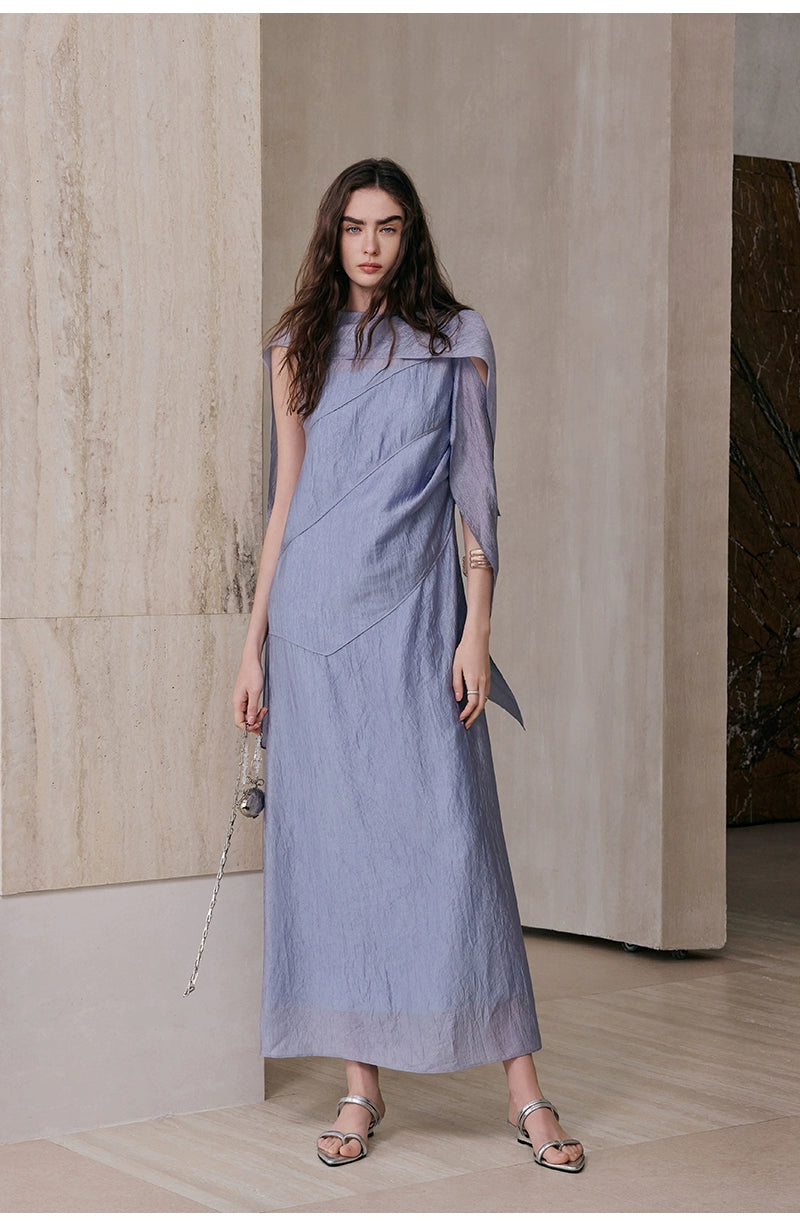 The straight-cut skirt creates a flattering silhouette, while the long, flowing ribbons can be artfully overlapped to achieve diverse styling options, subtly enhancing the shoulder line and conveying dynamic elegance. The sleeveless ribbon top incorporates a diagonally segmented, deconstructed design that adds visual depth and accentuates feminine curves. Crafted from soft and comfortable fabric, the ensemble embodies a harmonious blend of contemporary fashion and wearable comfort.