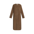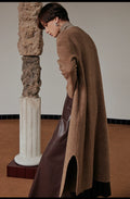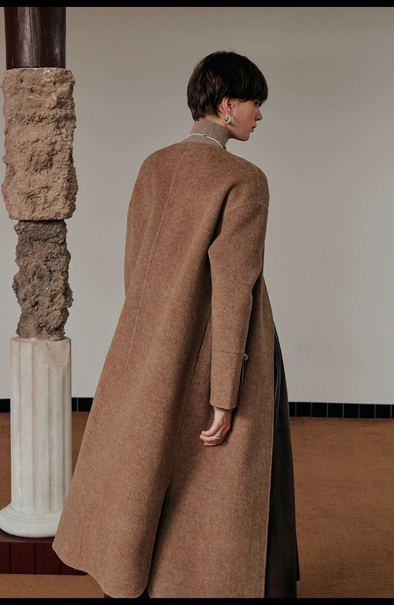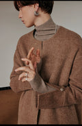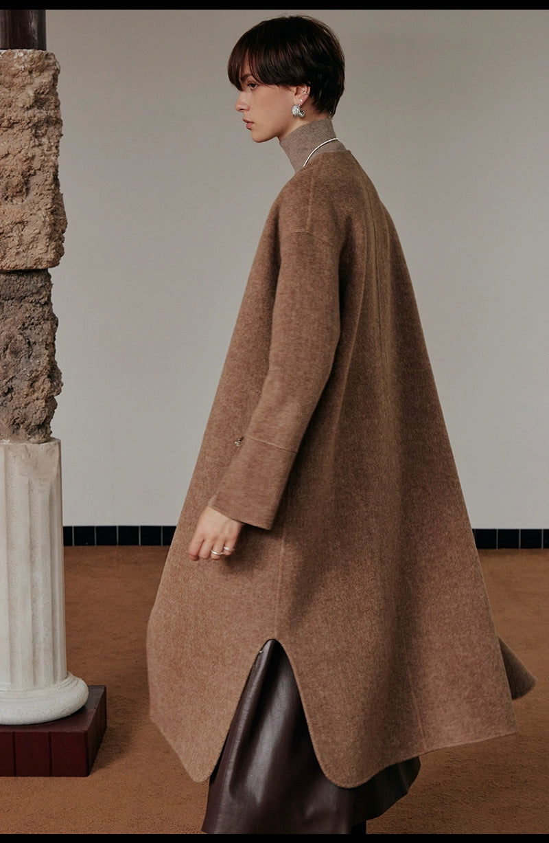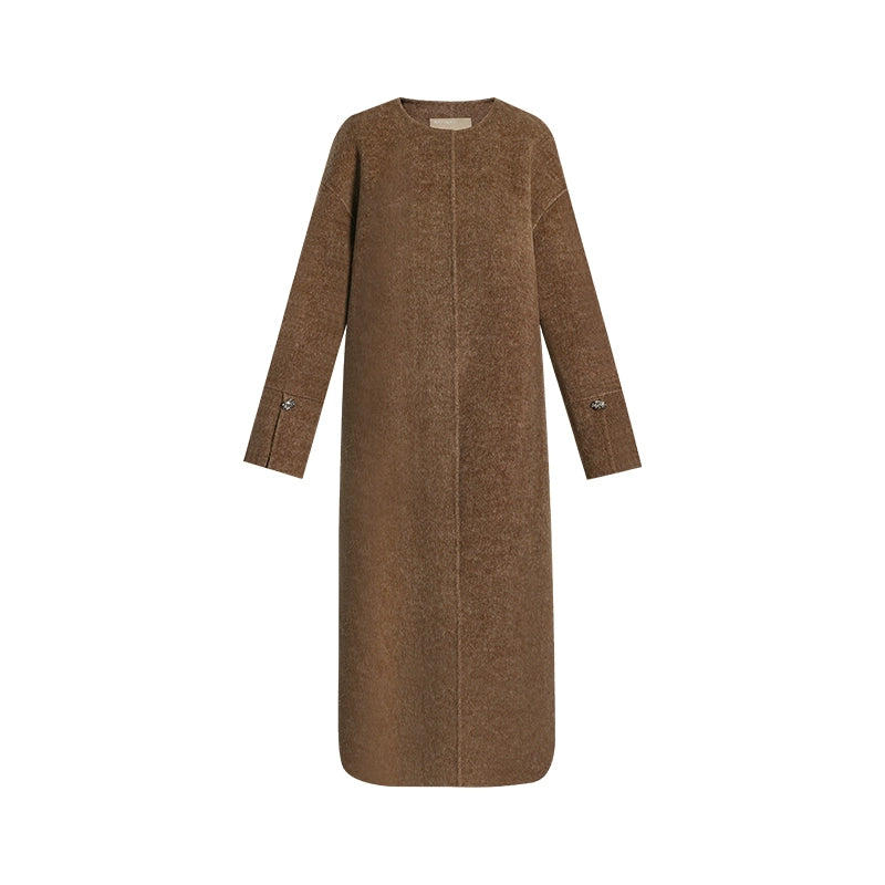 This long coat features a round neckline embodying a minimalist yet elegant design. Designed for versatile wear, it combines ease of movement with a refined sense of casual sophistication. The off-the-shoulder sleeve construction provides enhanced comfort and dimensional appeal. Slit cuffs are accentuated with irregularly shaped metal buckles, adding distinctive detailing that contributes to the garment’s relaxed aesthetic. The knee-length cut is thoughtfully proportioned to flatter the figure, creating an elongated and graceful profile. Curved side slits enhance fluidity in the drape, ensuring clean lines and a lightweight, slimming visual effect.