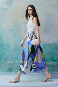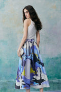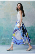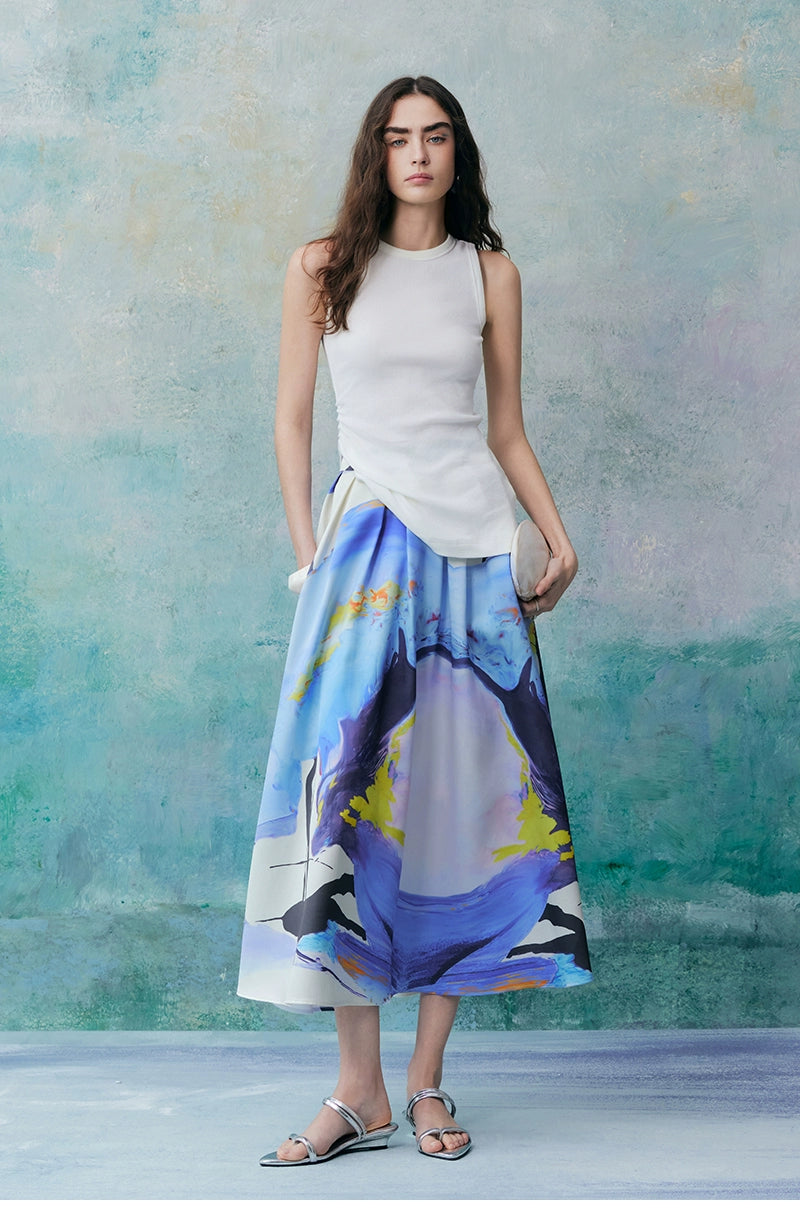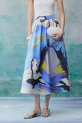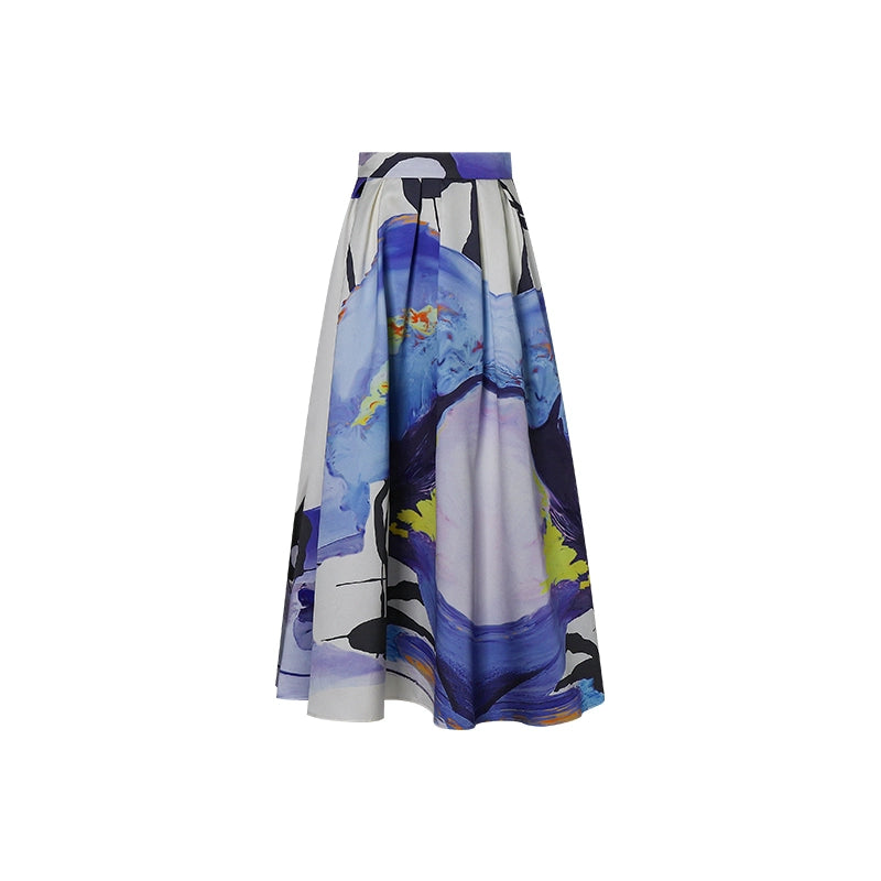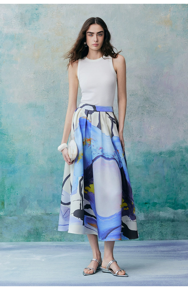The blue-toned pleated skirt features a clean, minimalist silhouette that enhances the wearer's refined elegance. The precision tailoring and carefully calibrated pleat structure impart fluidity and movement to the hemline, creating a graceful sway with each step, reflecting poise and self-assurance. The marine-inspired hue adds depth and visual texture to the design, evoking a strong artistic sensibility while capturing the essence of summer freshness within its fabric.