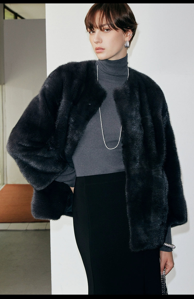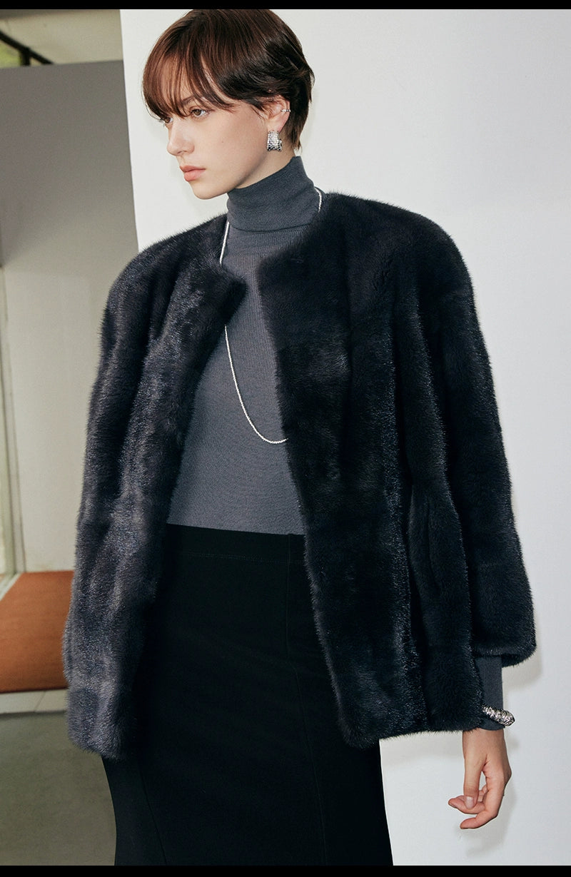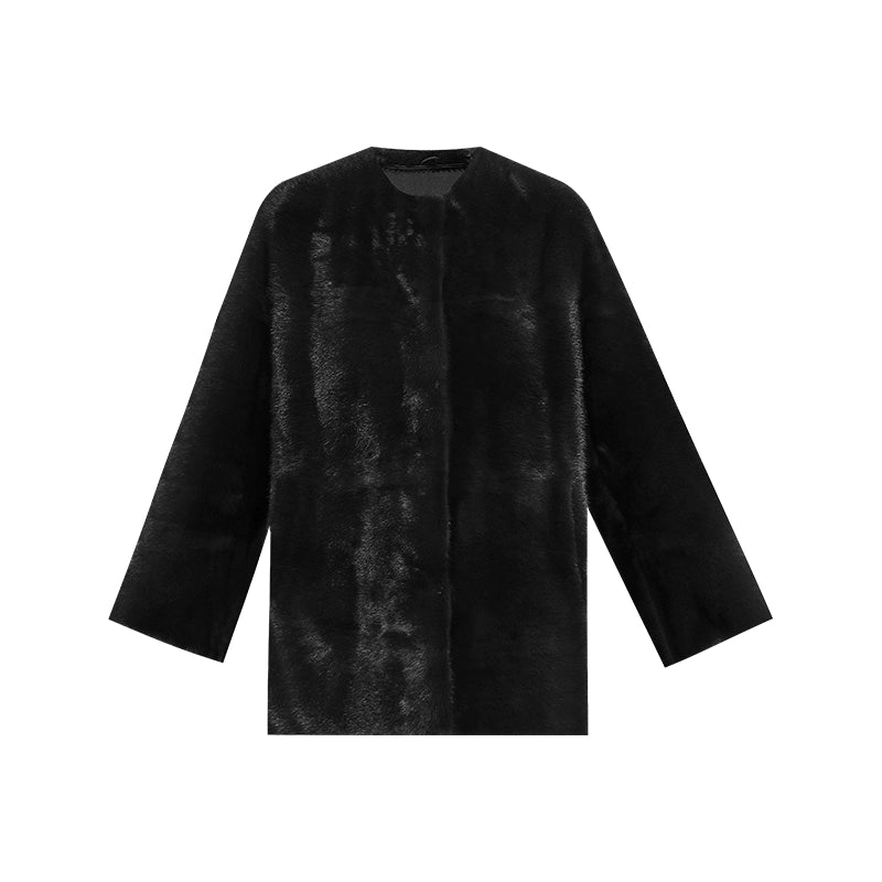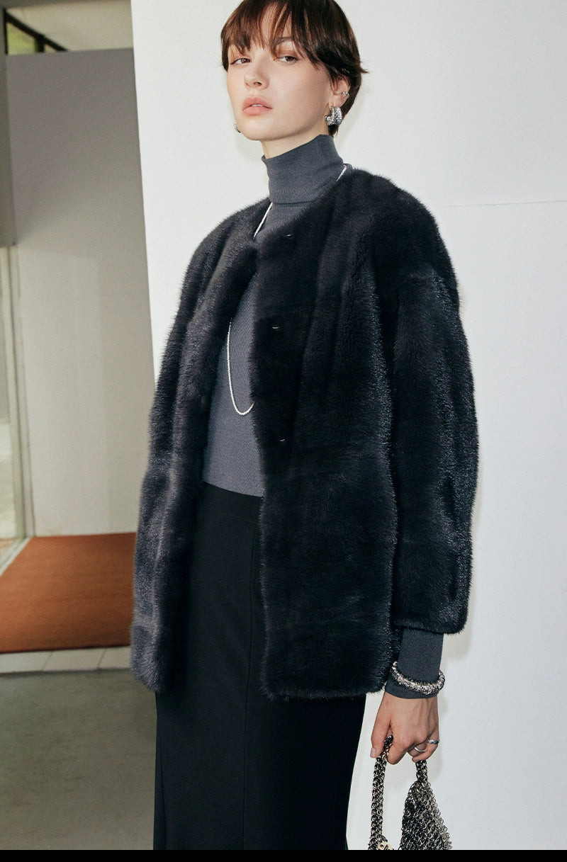 Black Round Neck Velvet Mink Fur Coat