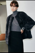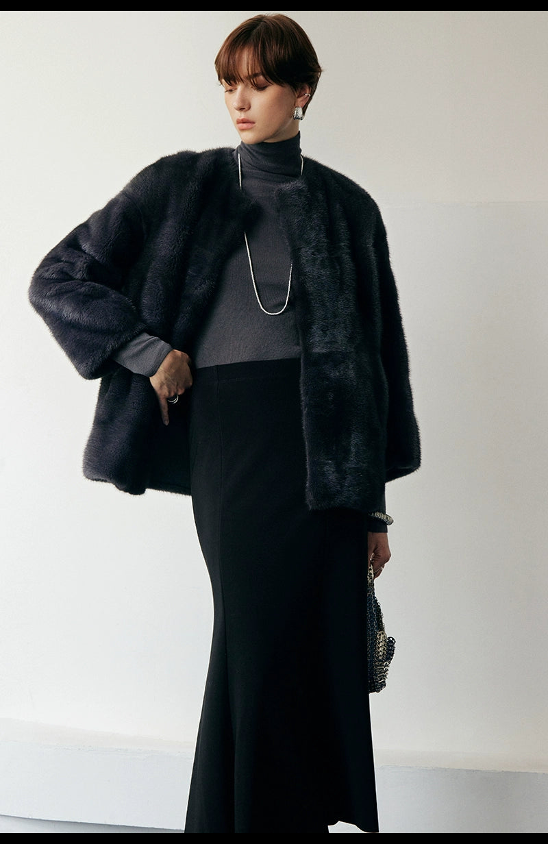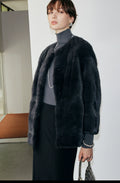 This round-neck mink coat features an inclusive silhouette crafted with exquisite attention to detail. Designed with a classic round neckline and an off-the-shoulder cut, it offers a stylish yet relaxed aesthetic, ensuring comfort and ease of movement. The entire garment is constructed using a horizontal fur-seaming technique, a labor-intensive and costly process that enhances the coat’s lightness and fluidity. When worn, it creates an elegant, slimming effect, complemented by a minimalist and youthful design. Functional double-sided pockets provide convenient storage, while the structured yet pliable construction seamlessly blends winter elegance with warmth.
