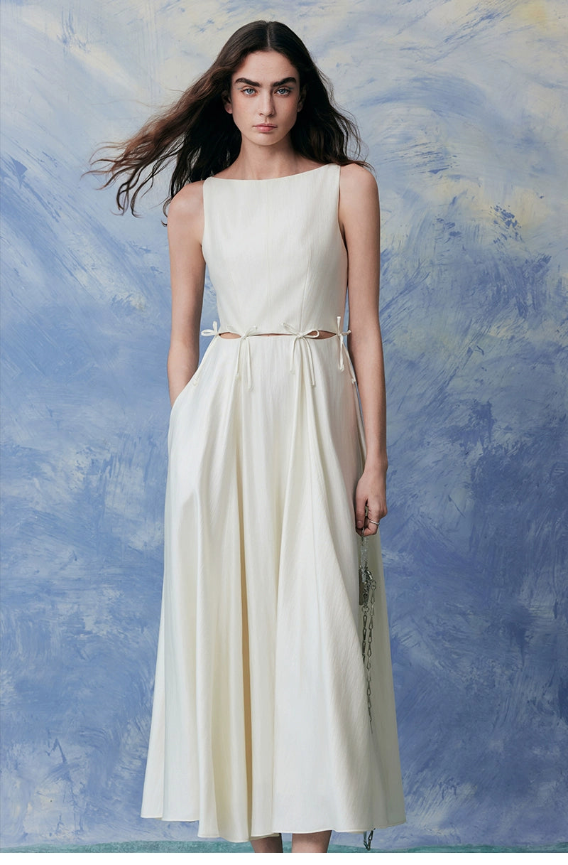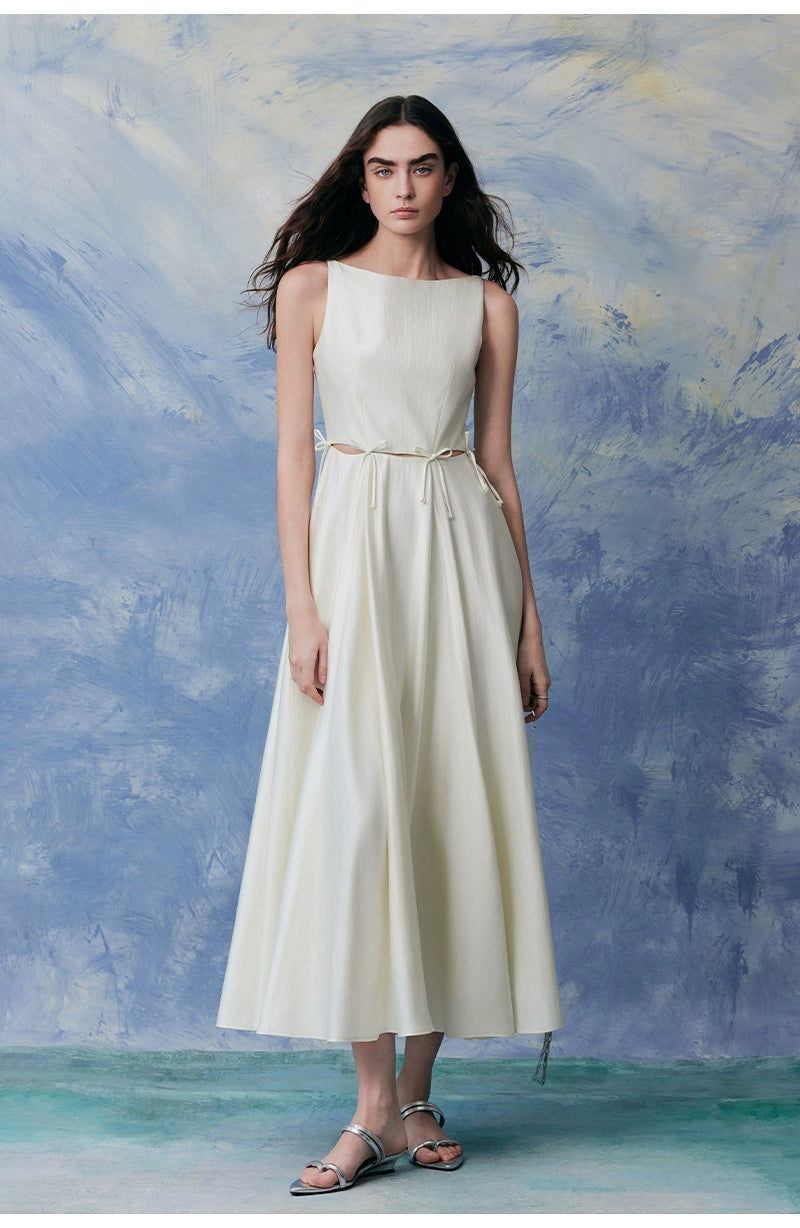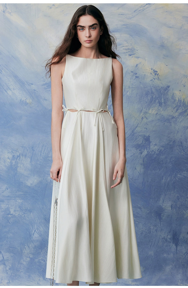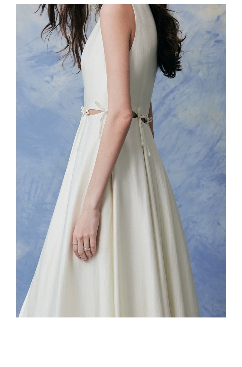 This one-shoulder, sleeveless long dress embodies simplicity and elegance. The high-waisted silhouette and A-line hem are thoughtfully crafted to enhance body proportions, seamlessly blending feminine grace with deconstructivist design elements. The waist features a cut-out detail accented by a bow tie, complemented by shell studs and beads for subtle embellishment. The skirt's hem is constructed from vertically arranged, umbrella-shaped panels, allowing fluid movement and enabling a graceful stride. This design reflects the multifaceted allure of contemporary women—romantic yet independent, delicate yet empowered. Guided by the design philosophy of "restraint and release," the dress establishes a poetic balance between exposure and coverage, expressing both modesty and confidence.