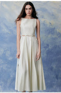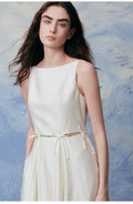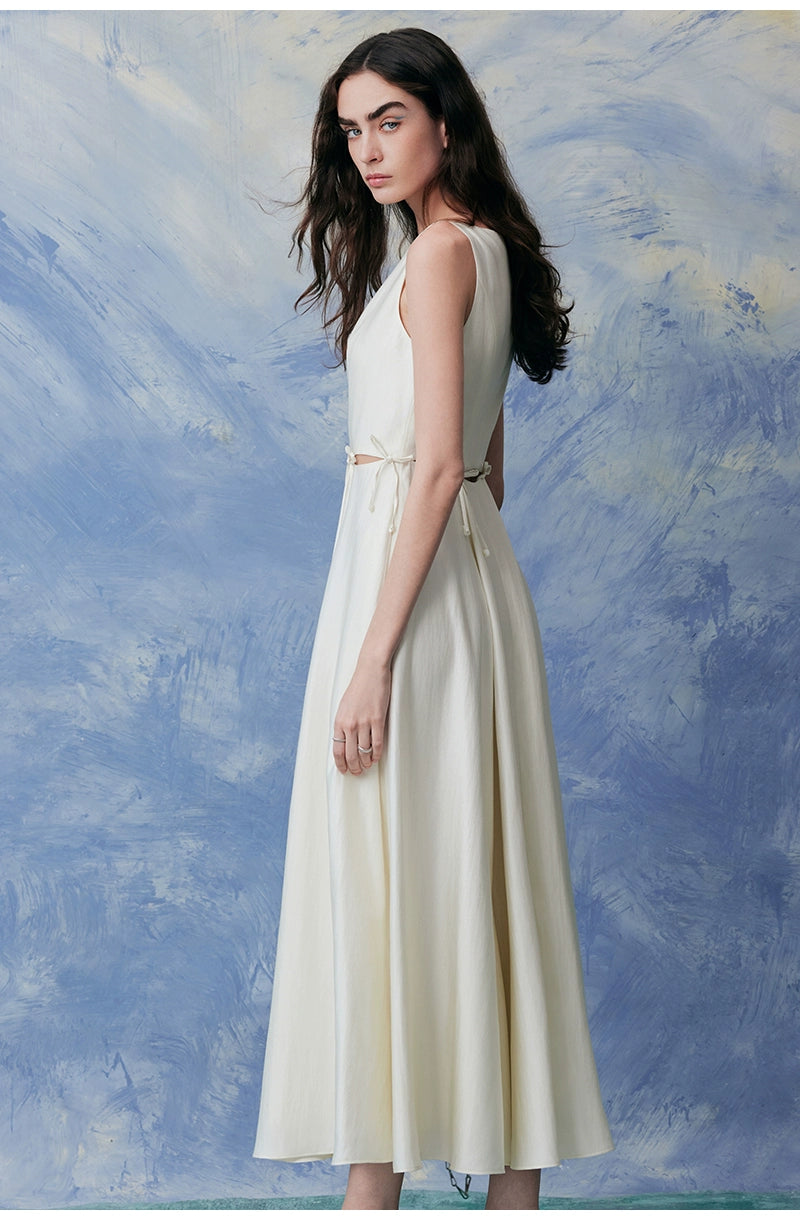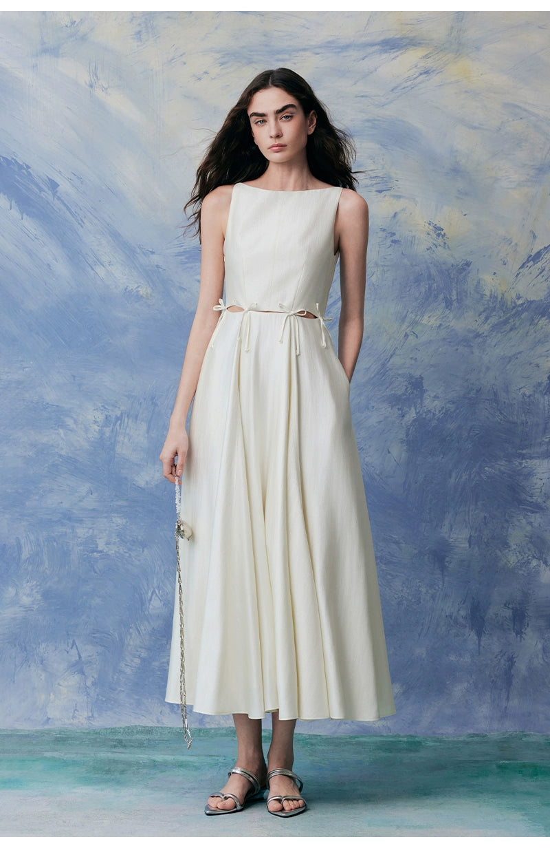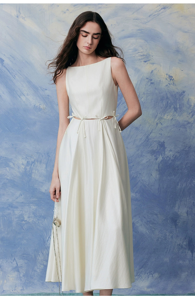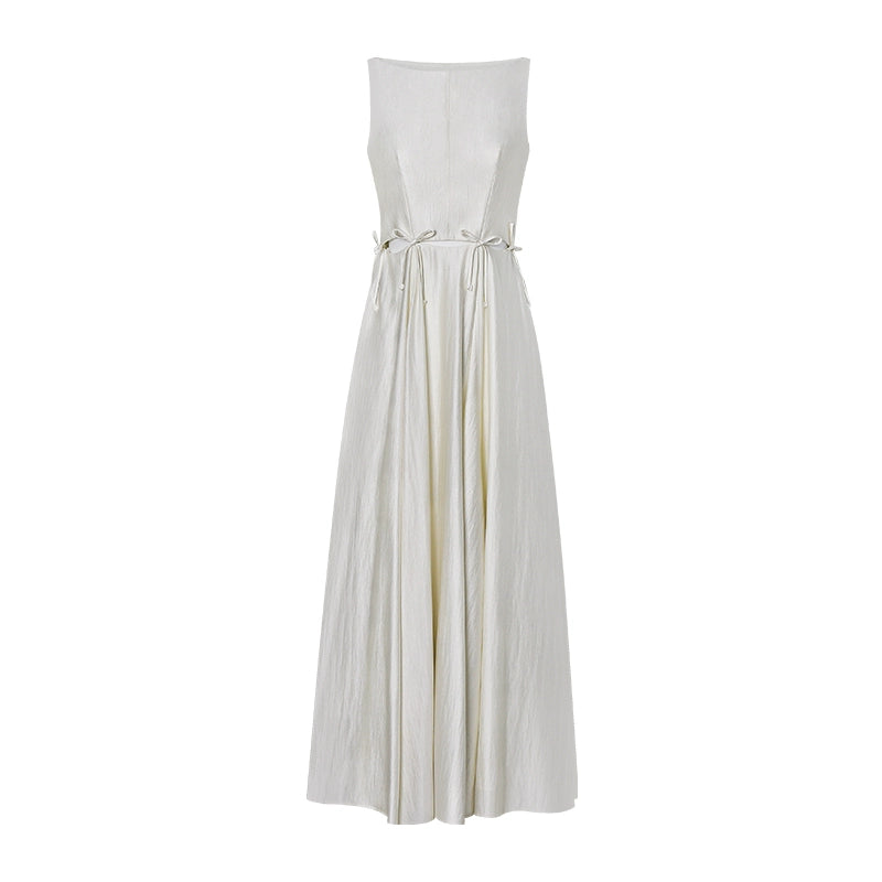 This one-shoulder, sleeveless long dress embodies simplicity and elegance. The high-waisted silhouette and A-line hem are thoughtfully crafted to enhance body proportions, seamlessly blending feminine grace with deconstructivist design elements. The waist features a cut-out detail accented by a bow tie, complemented by shell studs and beads for subtle embellishment. The skirt's hem is constructed from vertically arranged, umbrella-shaped panels, allowing fluid movement and enabling a graceful stride. This design reflects the multifaceted allure of contemporary women—romantic yet independent, delicate yet empowered. Guided by the design philosophy of "restraint and release," the dress establishes a poetic balance between exposure and coverage, expressing both modesty and confidence.