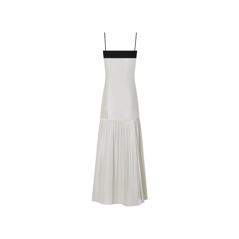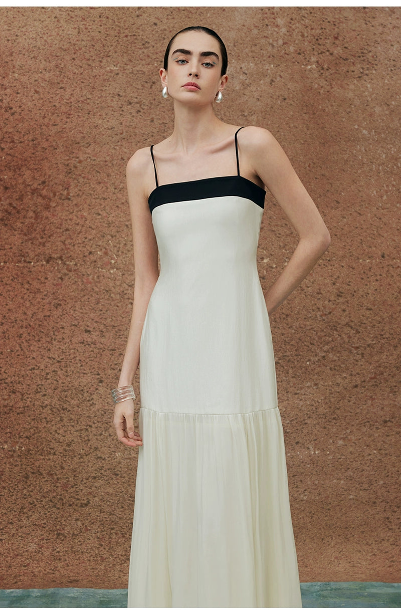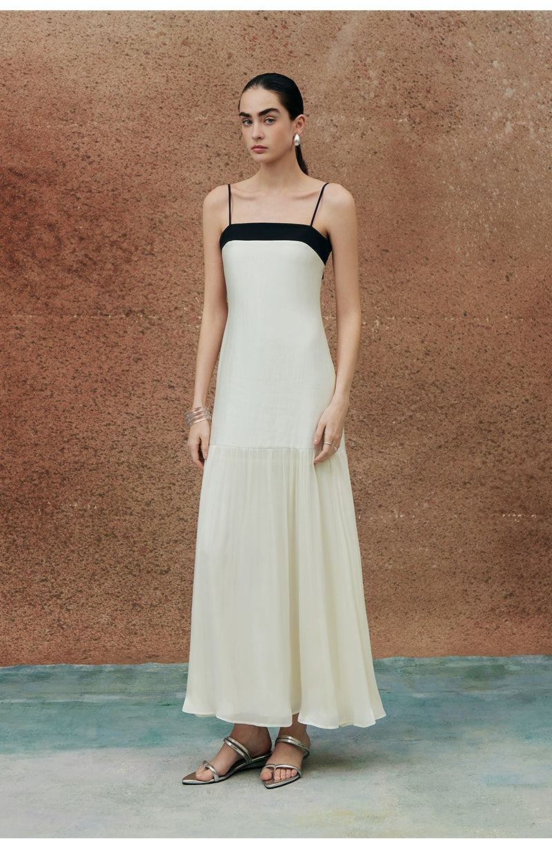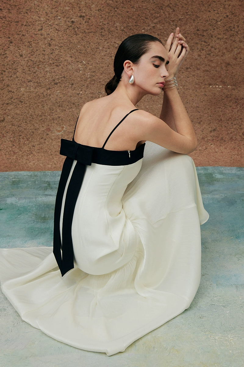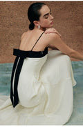 This form-fitting square-neck halter dress features a refined three-dimensional bow at the back, with ribbons that flow naturally and sway gracefully with movement, creating an elegant and romantic aesthetic. The thoughtful combination of three distinct fabric materials adds visual and textural contrast, enhancing the garment’s uniqueness and sophistication. Delicately proportioned shoulder straps offer subtle skin exposure, evoking the light and refreshing sensation of a summer breeze.