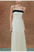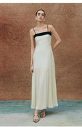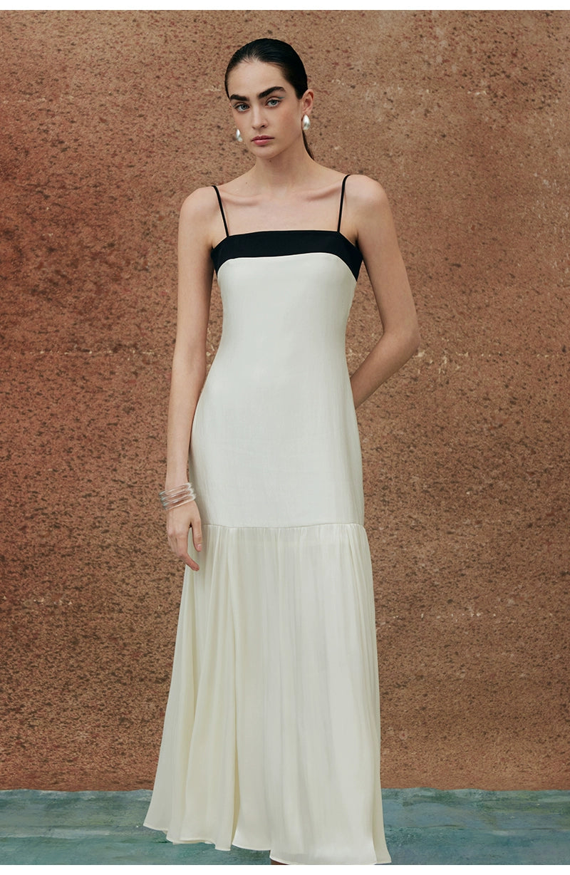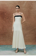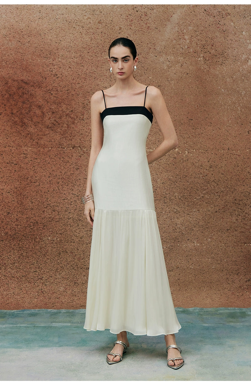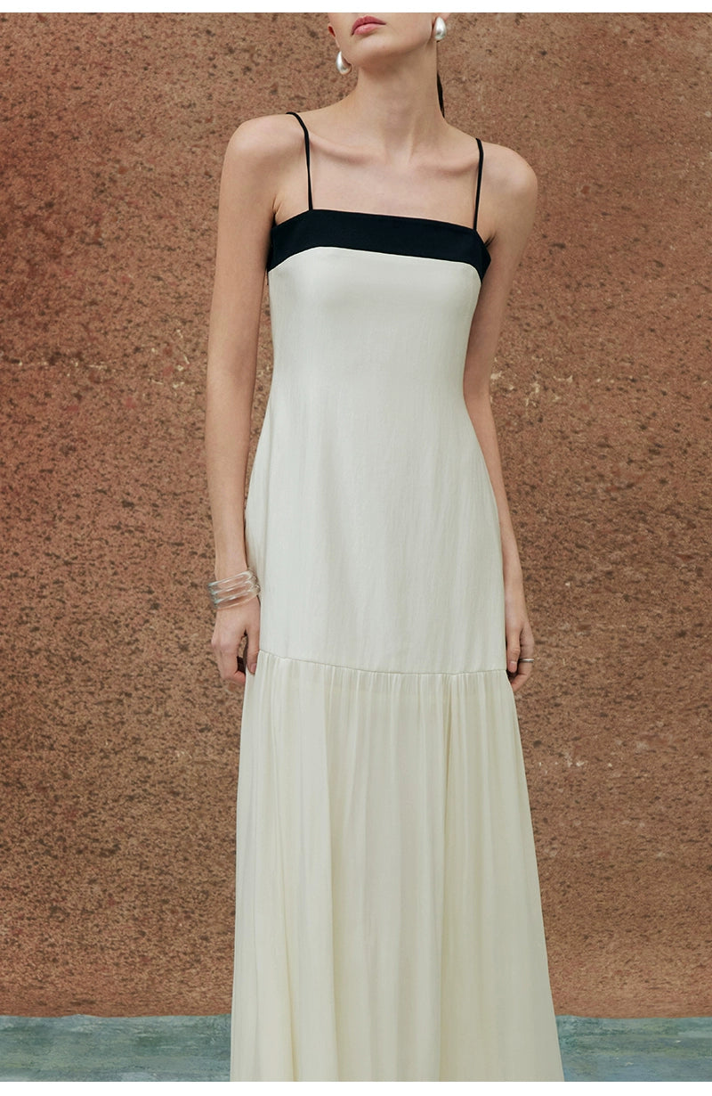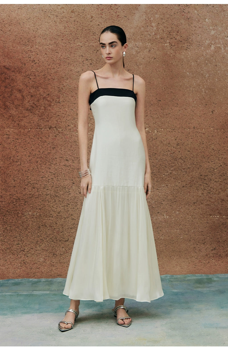 This form-fitting square-neck halter dress features a refined three-dimensional bow at the back, with ribbons that flow naturally and sway gracefully with movement, creating an elegant and romantic aesthetic. The thoughtful combination of three distinct fabric materials adds visual and textural contrast, enhancing the garment’s uniqueness and sophistication. Delicately proportioned shoulder straps offer subtle skin exposure, evoking the light and refreshing sensation of a summer breeze.
