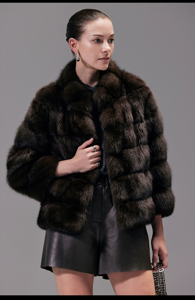 Russian-imported starry purple mink features a rich brownish-amber hue that enhances skin tone and imparts a radiant complexion. Its exceptional appearance exudes elegance and sophistication. The exclusive three-dimensional silhouette effortlessly conveys a relaxed yet refined posture, while the tailored short design optimizes body proportions. The loose three-quarter sleeve adds a contemporary and fashionable touch to the overall aesthetic.