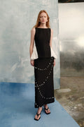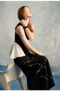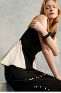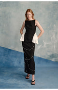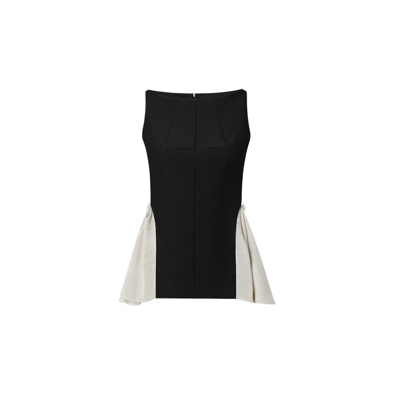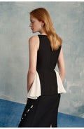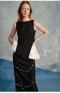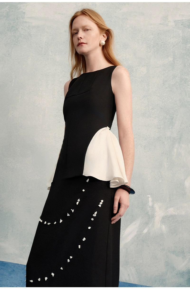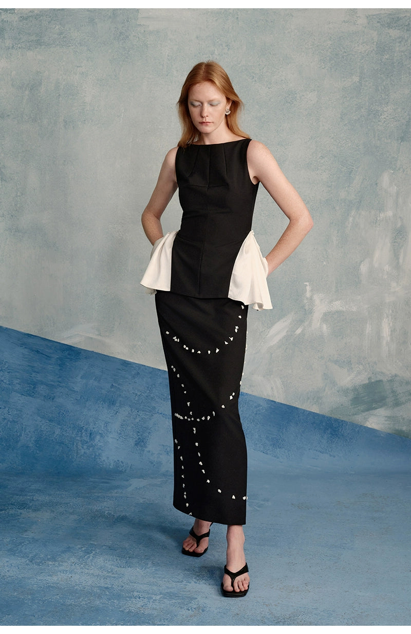 A sleeveless, cinched-waist one-shoulder top crafted in timeless black and white tones. The distinctive pleated detailing along the side waist creates a three-dimensional undulating effect, accentuated with embellishments of shell pebbles, resulting in an intricate and visually striking design that combines innovation with functionality. Paired with a classic straight-leg skirt, the minimalist silhouette offers a sophisticated aesthetic suitable for professional or urban commuting settings.
