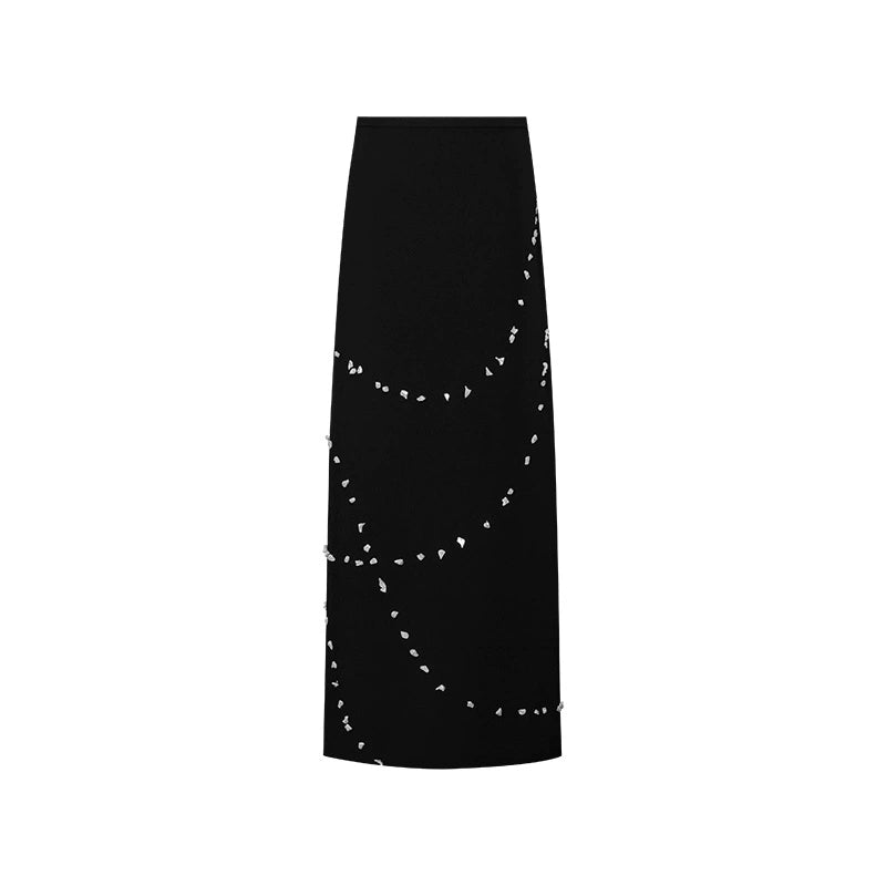 The skirt features irregularly shaped natural shell fragments artistically arranged in fluid, dynamic patterns. Entirely handcrafted by skilled artisans, each piece is meticulously assembled to achieve a harmonious blend of elegance and uniqueness. Together, the ensemble embodies refined sophistication, enhancing the wearer’s presence with a modern yet graceful urban elegance.