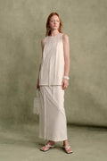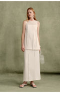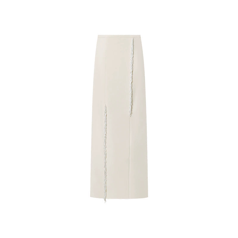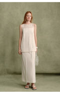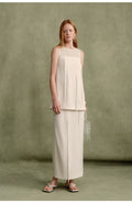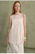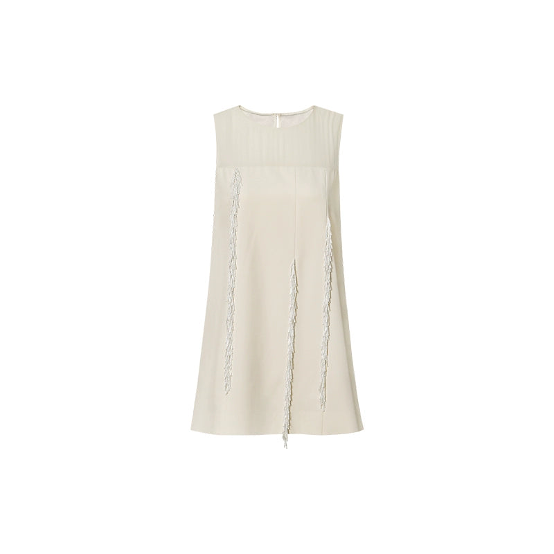 The overall silhouette is defined by clean, straight lines, conveying a sense of ease and understated comfort. The pristine white dress, refined and distinctive, embodies the inherent elegance and grace characteristic of feminine sophistication. A softly rounded neckline crafted from lightweight, finely textured fabric introduces a subtle, ethereal quality. Tubular tassels are thoughtfully arranged in an asymmetrical pattern across the front, swaying gently with movement and enhancing the dynamic, artistic allure of French-inspired design.