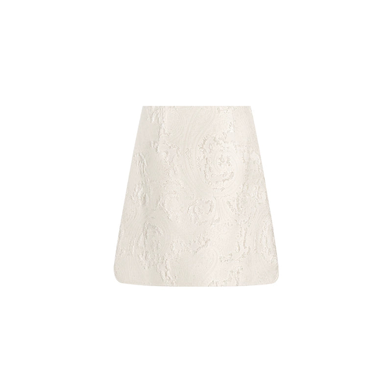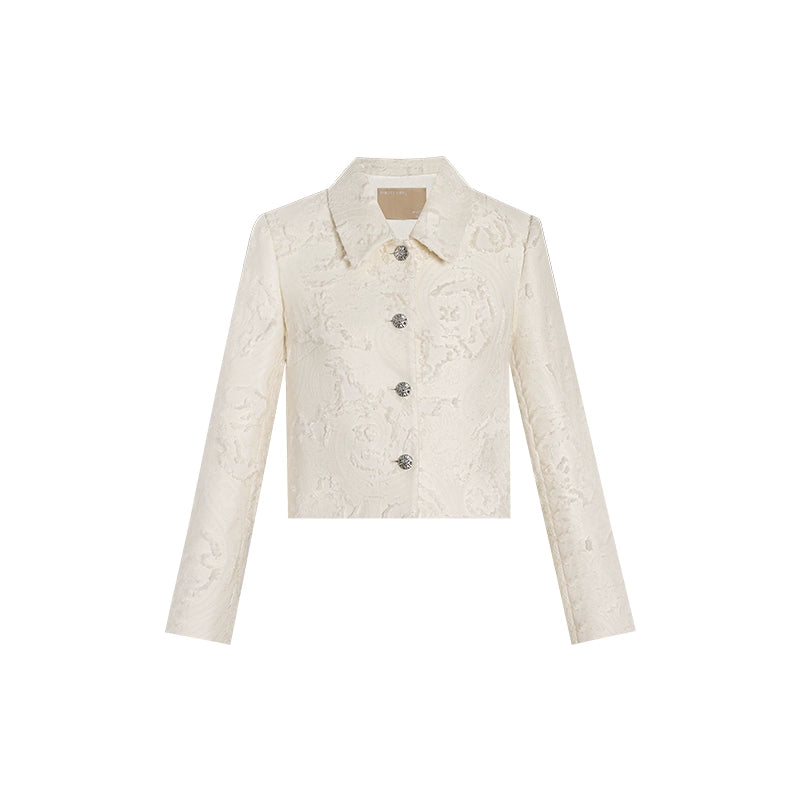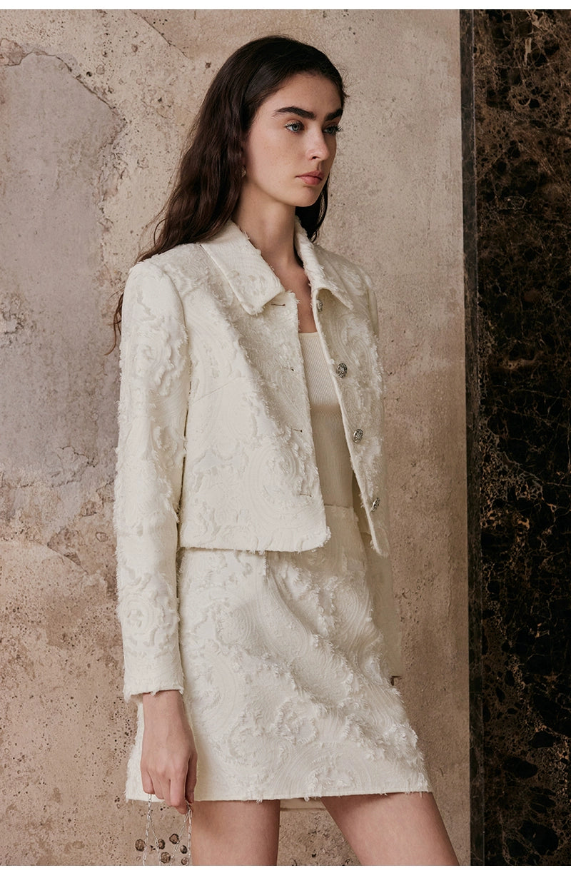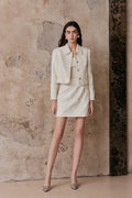 This classic box-shaped lapel short coat features clean, well-defined lines that effectively contour the figure, conveying an elegant and refined aesthetic. The lapel has been meticulously proportioned through multiple design iterations, resulting in a sophisticated structure that enhances facial contours through visual elongation. The custom-crafted diamond clasp adds a touch of brilliance, contributing to an overall impression of understated luxury and timeless elegance. When paired with a matching A-line skirt in the same fabric, the ensemble effortlessly creates a streamlined silhouette, achieving a poised and polished look suitable for both formal and semi-formal occasions.