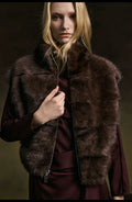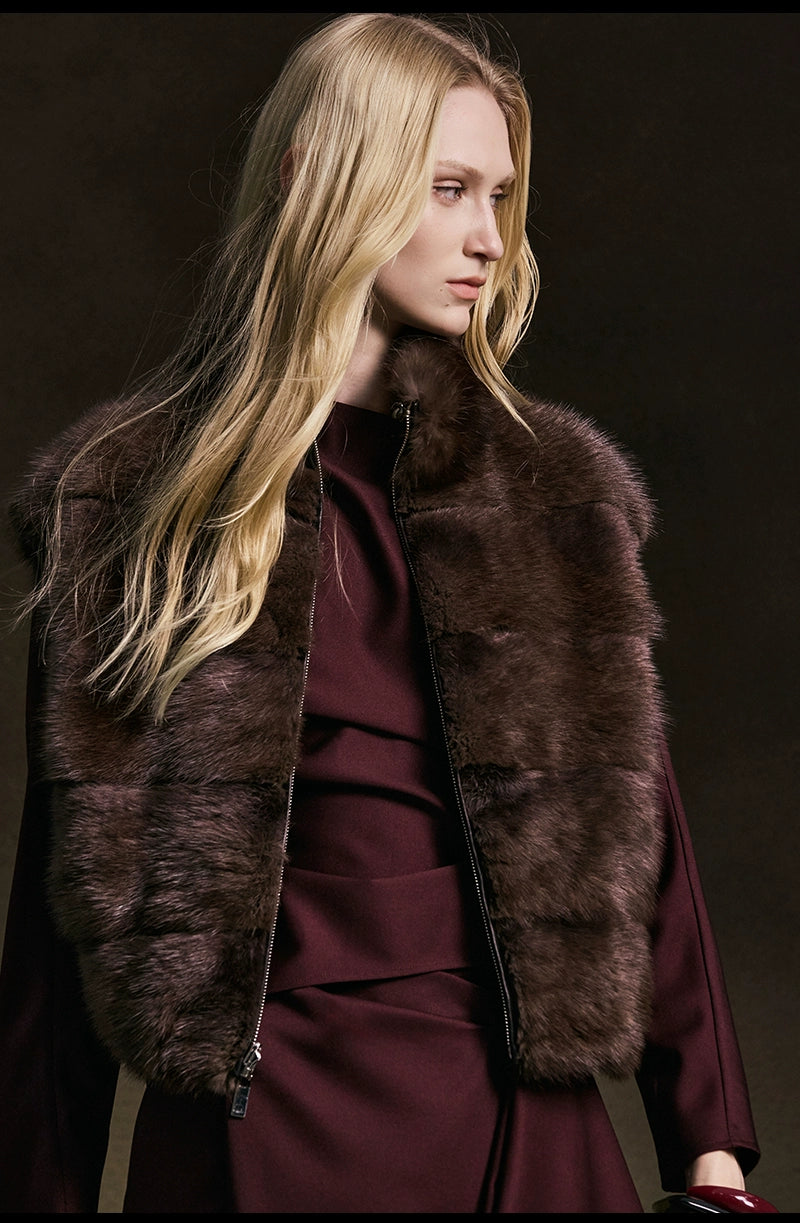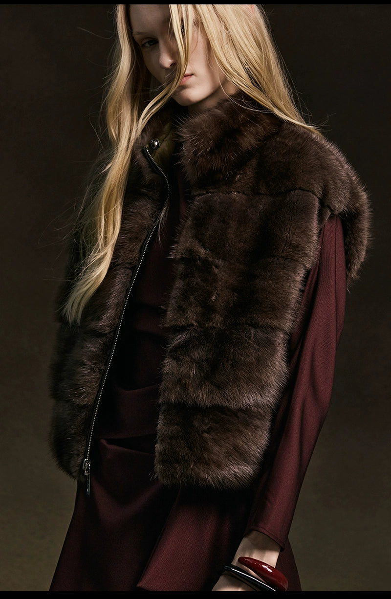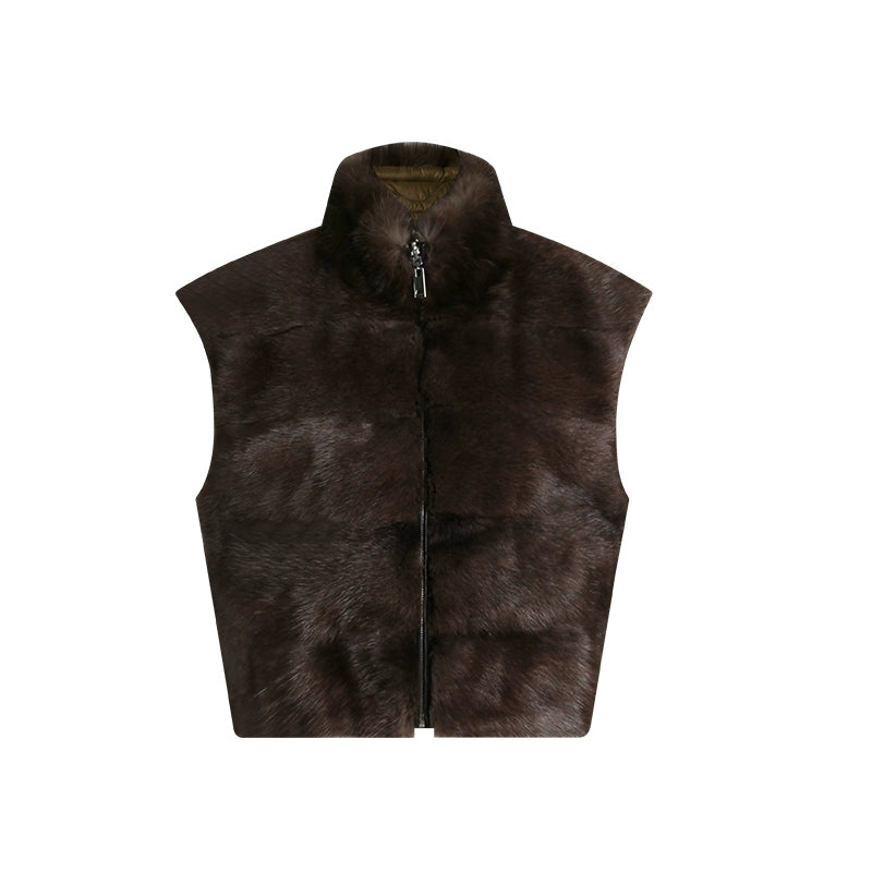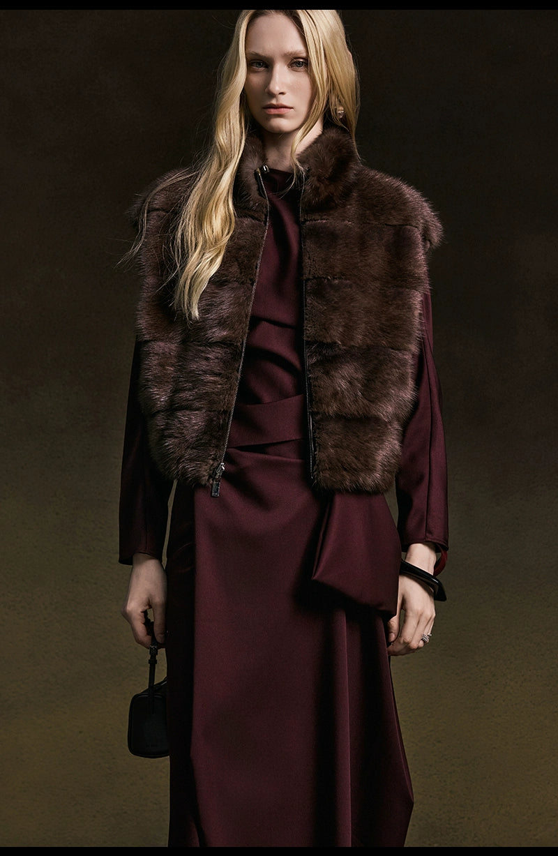 The boxy stand-up collar vest has clean lines that enhance any outfit. Made from premium purple and blue mink pelts, it shows high craftsmanship. One side features horizontal ridges with fringe for a luxurious look. The other side uses high-density nylon, lined with camel hair for warmth. 3D wavy seams shape the fit and reduce bulk. The reversible design allows two styles for different occasions. A metal zipper makes it easy to wear and remove. Adjustable drawstrings at the neck and hem help retain heat and block wind.