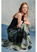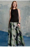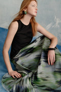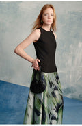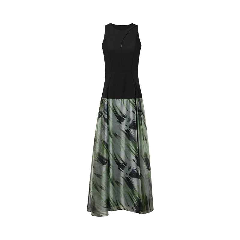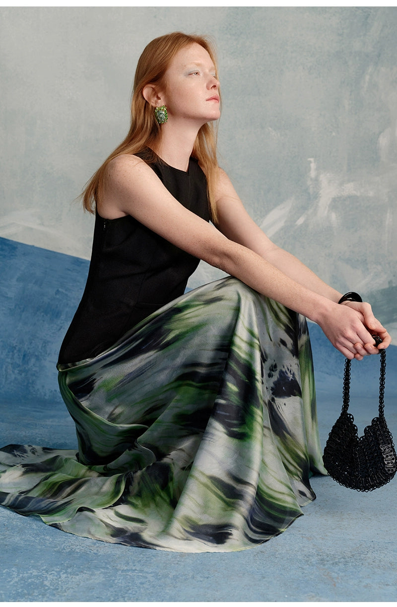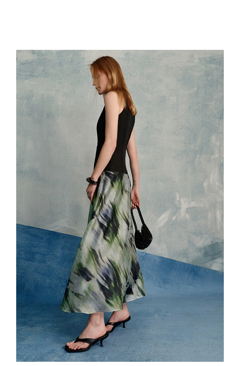 A sleeveless, loose-fitting round-neck top featuring a distinctive cut with an overlapping and hollowed-out arc-shaped detail on the left shoulder. The chest panel is uniquely structured for enhanced visual appeal. The hem showcases an abstract printed artwork reminiscent of a gently undulating and vibrant sea surface, combining creative ingenuity with high versatility and wearing comfort.