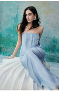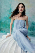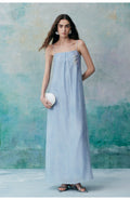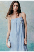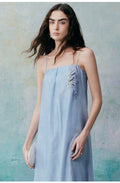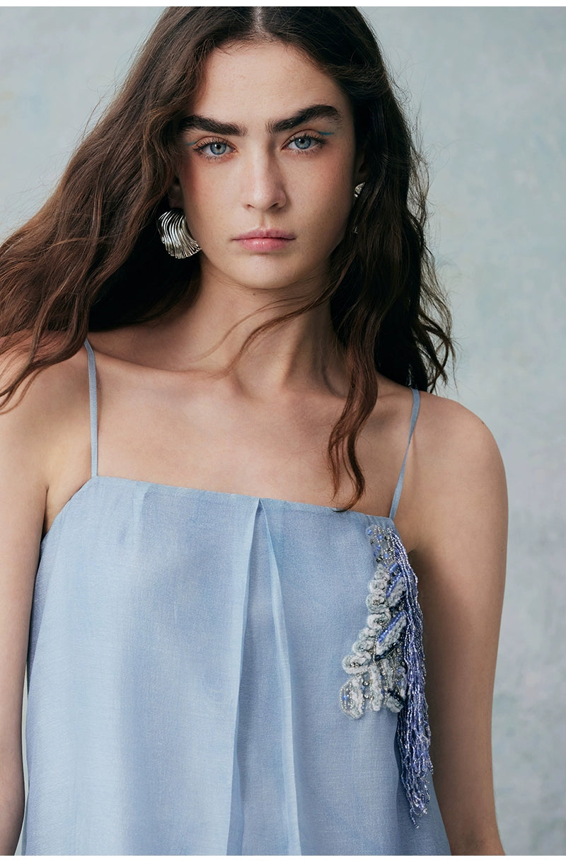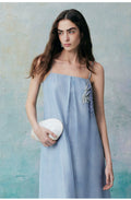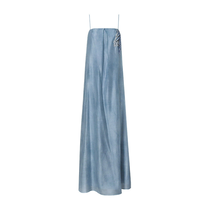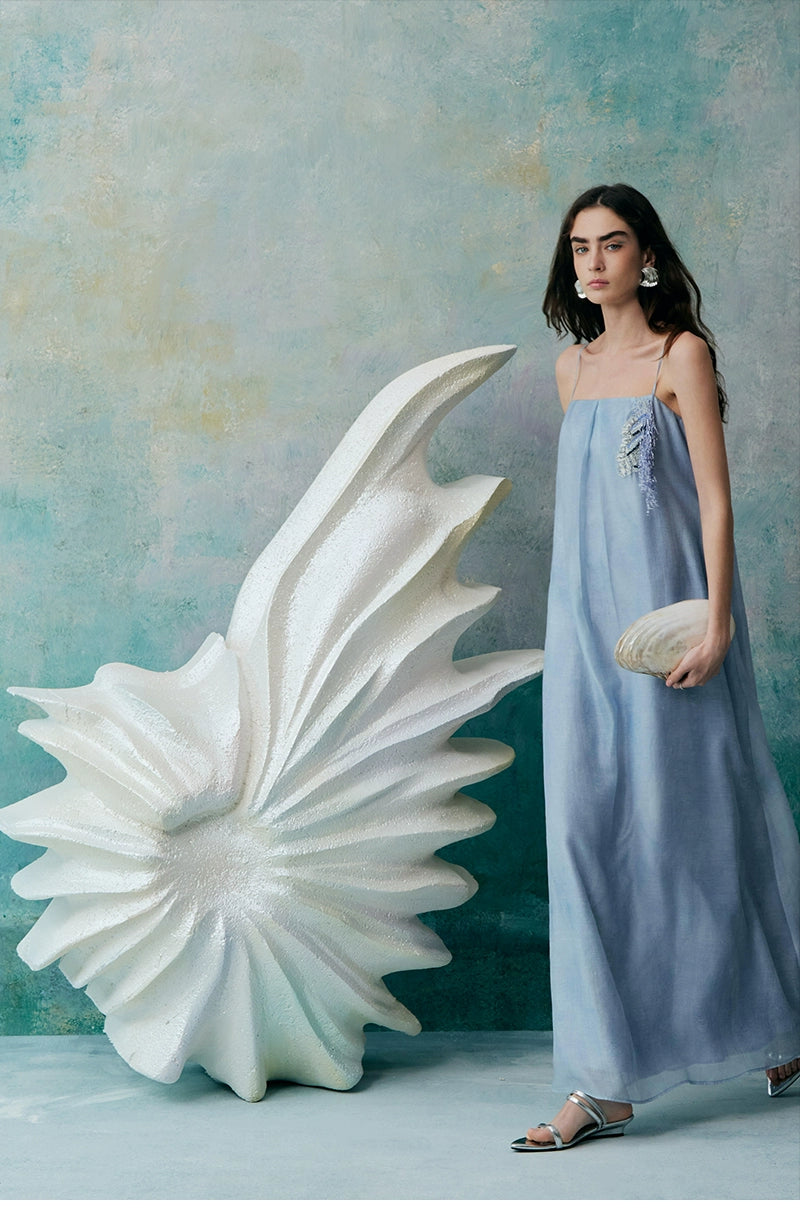 A minimalist halter dress that elegantly highlights the collarbone. The relaxed and comfortable A-line silhouette, characterized by clean lines and a fluid cut, creates a laid-back yet refined aesthetic. Crafted from lightweight fabric that gently moves with the breeze, it offers a free and effortless wearing experience, enhancing the comfort and romantic essence of summer. The bodice features custom-embroidered beaded Suzhou embroidery, delicately arranged to resemble a flowing constellation tracing gracefully around the body. Subtle interplays of light and shadow, combined with the refined Tencel fabric adorned with water-inspired patterns, evoke a sense of natural vitality and poetic elegance.