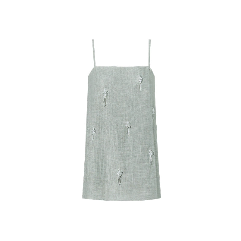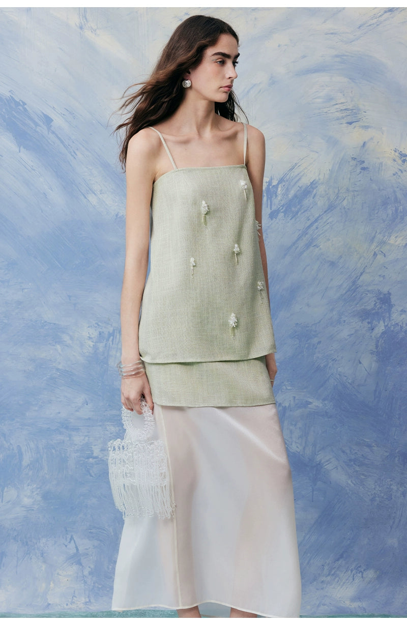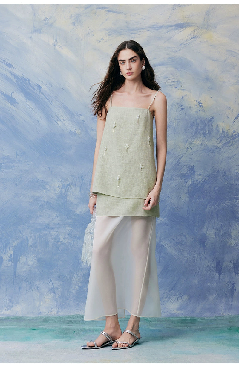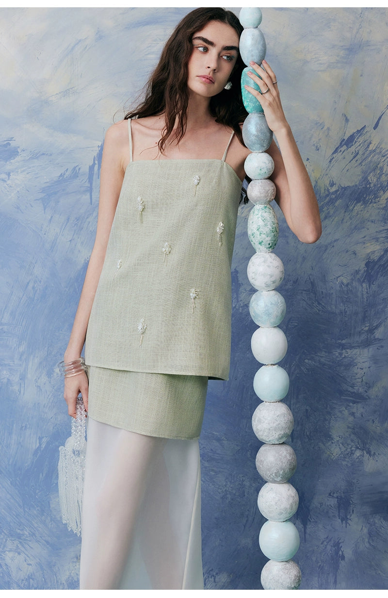 The slender-strap top, designed with a moderate degree of ease, has undergone several refinements to its length proportions, resulting in an optimal fit that gently contours the body’s natural curves while ensuring comfort and functionality. The minimalist halter neckline evokes the lightness and serenity of a summer breeze, enhancing the wearer’s elegance. Handcrafted beading adorns the garment, with three-dimensional tassels and beads arranged in alternating sequence. Suspended beaded tubes sway subtly with movement, producing a delicate interplay of transparency and dynamism.