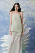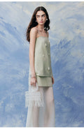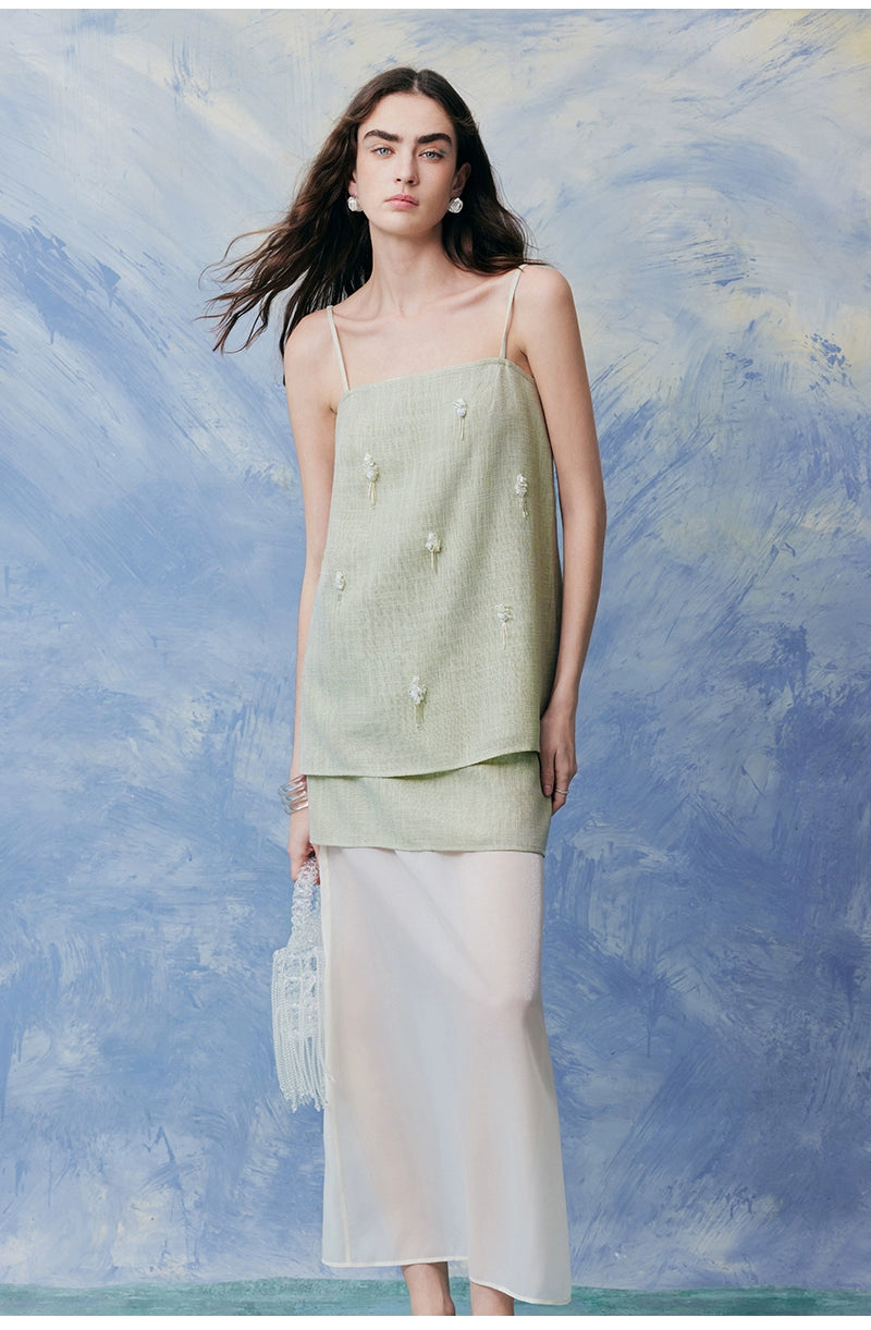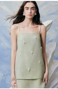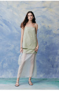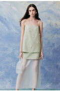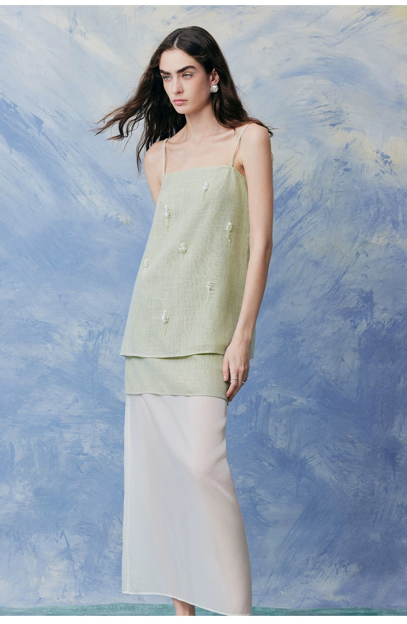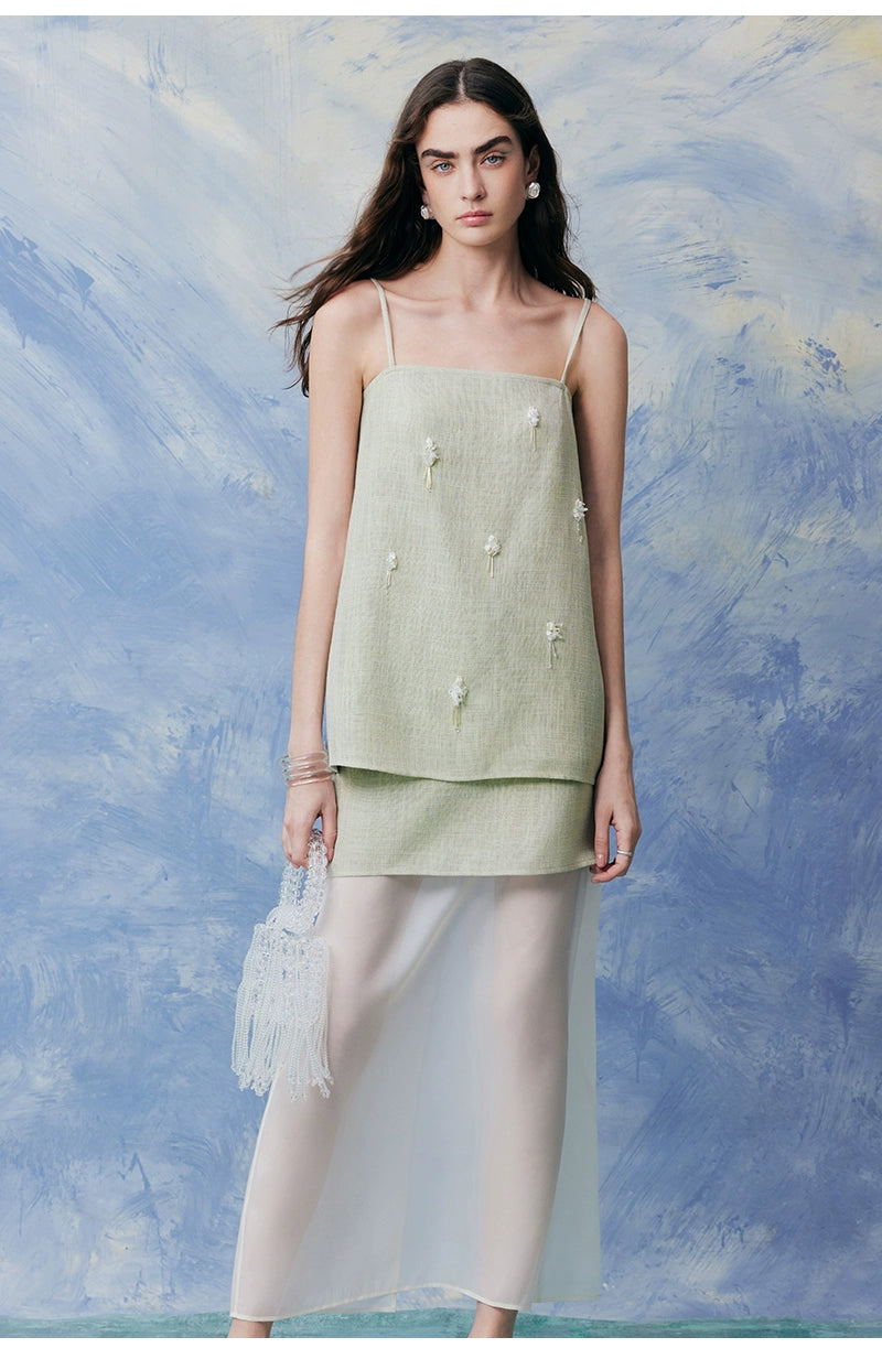 The slender-strap top, designed with a moderate degree of ease, has undergone several refinements to its length proportions, resulting in an optimal fit that gently contours the body’s natural curves while ensuring comfort and functionality. The minimalist halter neckline evokes the lightness and serenity of a summer breeze, enhancing the wearer’s elegance. Handcrafted beading adorns the garment, with three-dimensional tassels and beads arranged in alternating sequence. Suspended beaded tubes sway subtly with movement, producing a delicate interplay of transparency and dynamism.