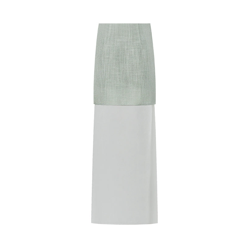 The inner skirt of the lower garment is meticulously proportioned and seamlessly integrated with the upper body, contributing to a cohesive and elevated silhouette. The strategic layering of the outer fabric with ice silk satin achieves a balanced visual contrast between strength and softness, embodying a refined aesthetic. Each step reveals a subtle, understated grace, characterized by a sense of ethereal reserve.