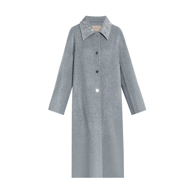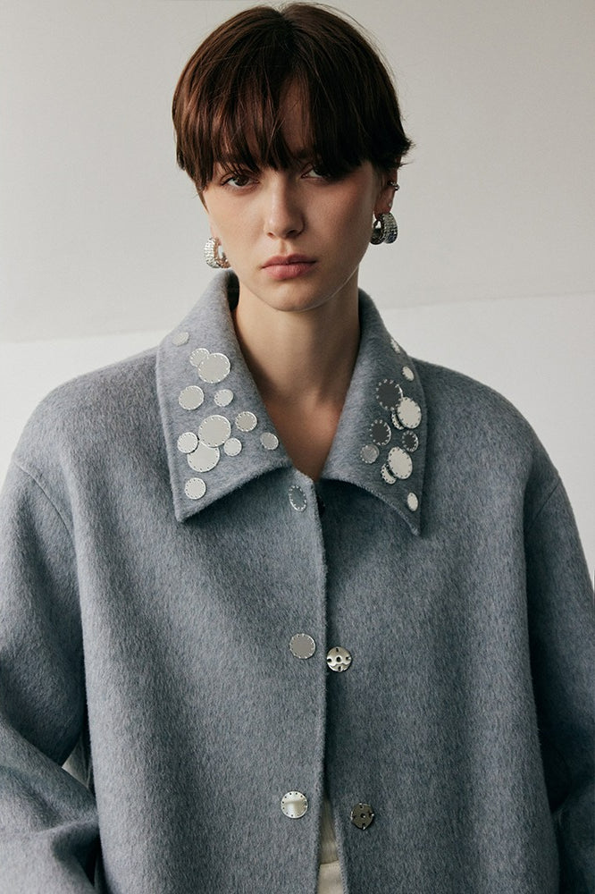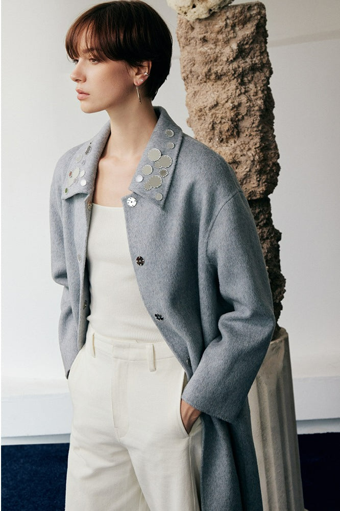The straight silhouette features a clean and elegant design with two functional pockets. The smoky blue hue imparts a refined and harmonious visual impression. Precise tailoring ensures smooth, flowing lines that enhance the overall structure. Oversized lapels are artistically layered with asymmetrical mirror embellishments, creating a sophisticated interplay of form and detail.