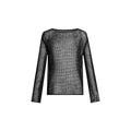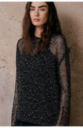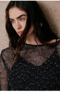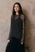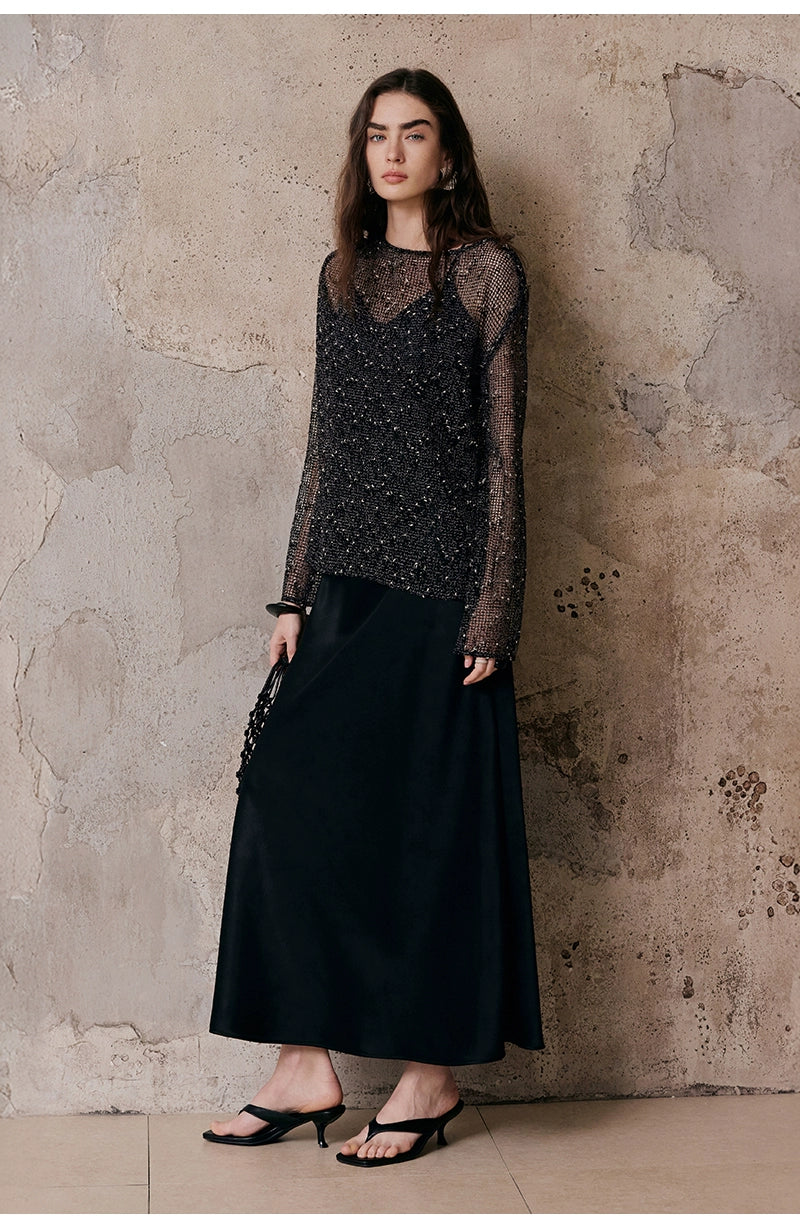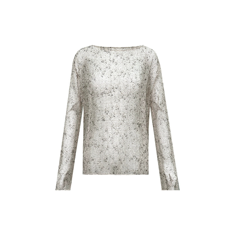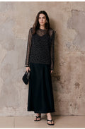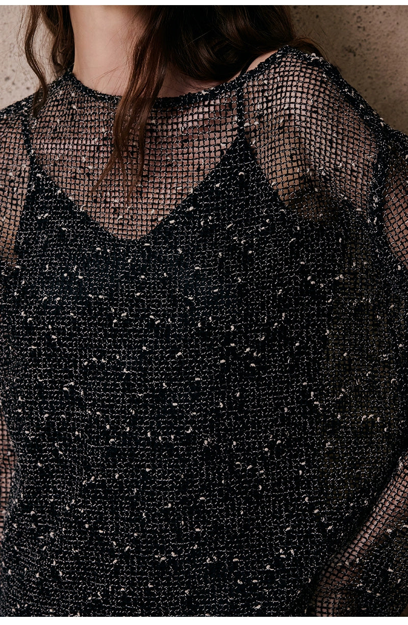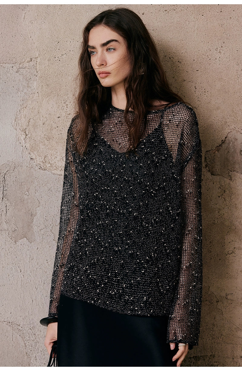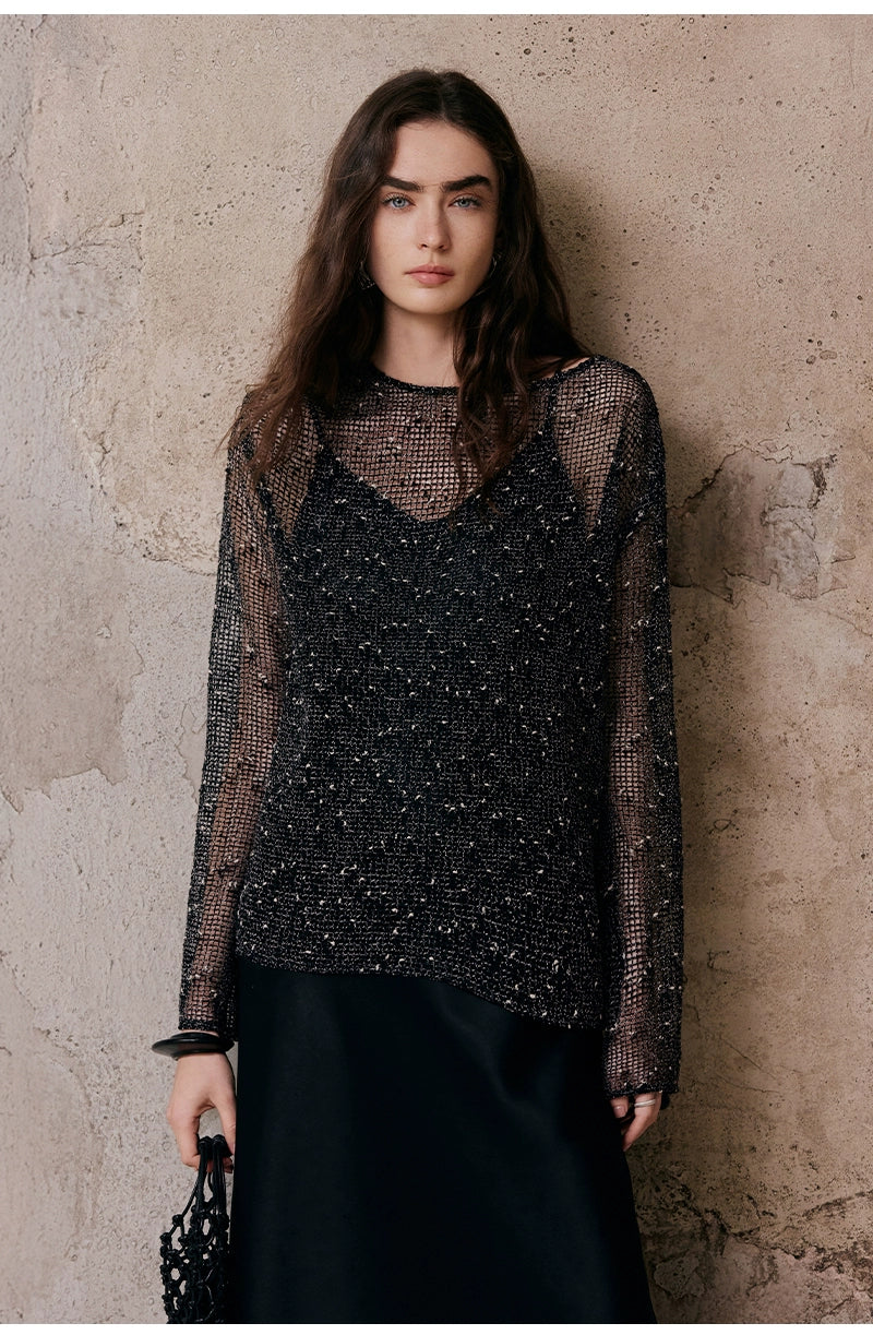 The intricately woven blouse features a refined and elegant silhouette, offering both comfort and practicality while providing a universally flattering, slimming effect. The clean one-line neckline design conveys a sense of urban sophistication and relaxed elegance. Soft light filtering through the fabric enhances the garment’s airy aesthetic, adding subtle grace and effortless charm. Crafted from premium yarns, the piece is meticulously constructed to create a visually appealing and lustrous fabric surface, radiating a delicate and refined ambiance.