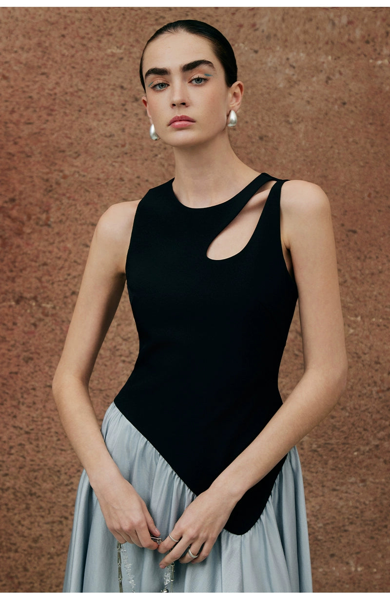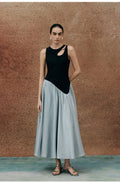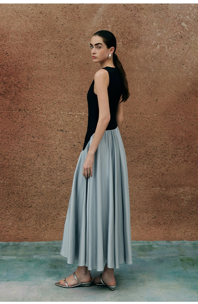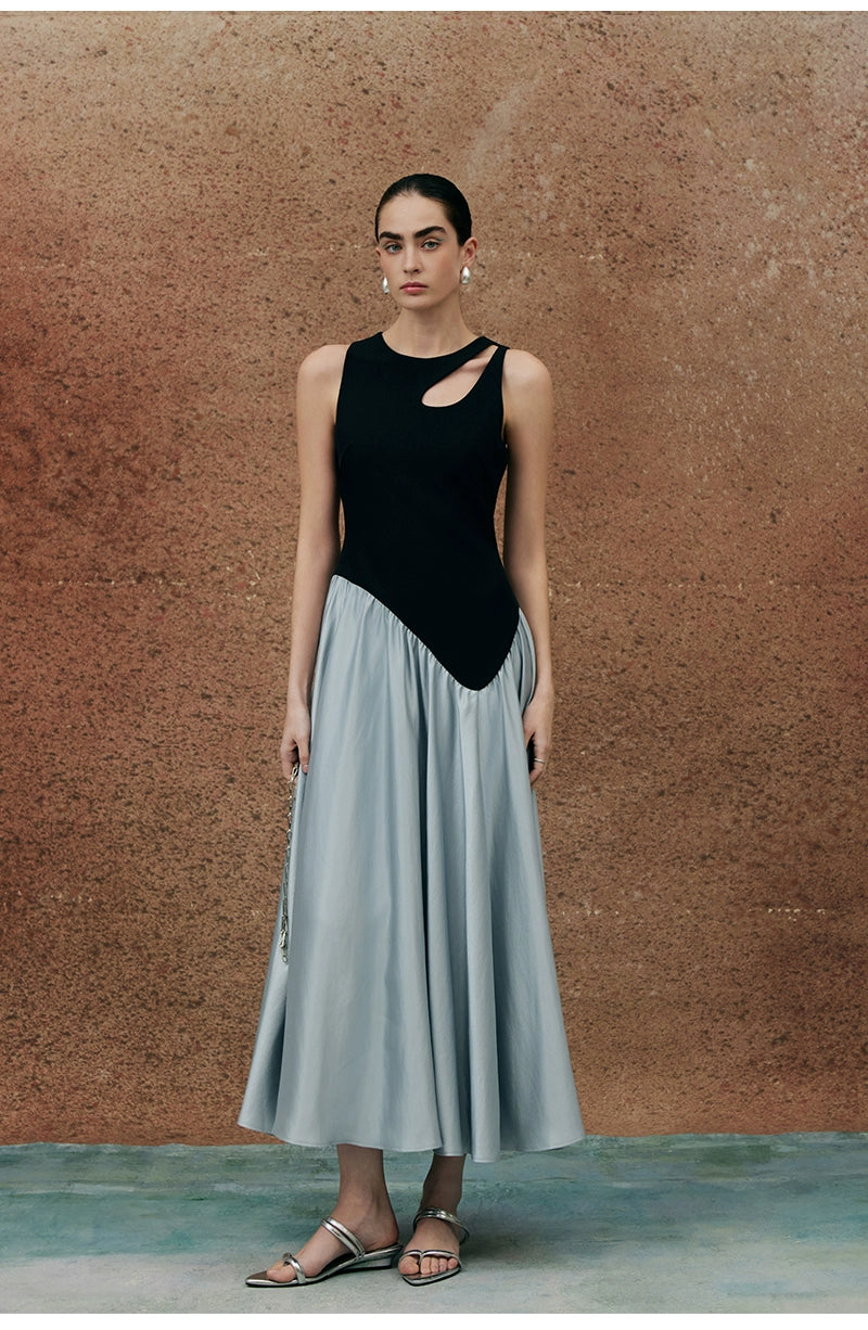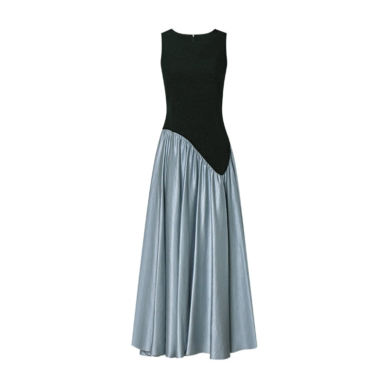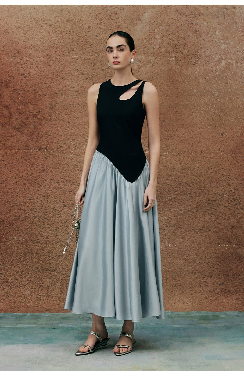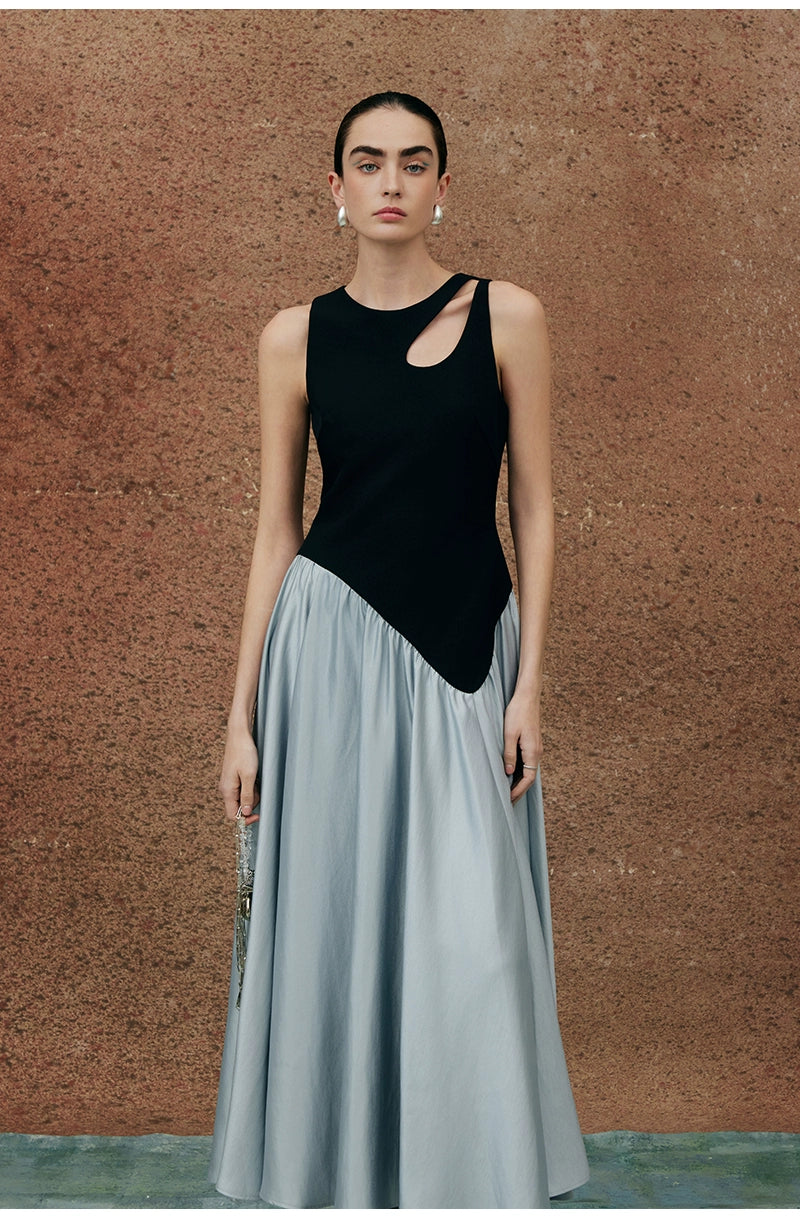 This round-neck and cinched waist patchwork dress, with its exquisite artistic cutouts, delicately exposes the skin, breaking the dullness of black and presenting a relaxed and fashionable look. The waist is designed with a cinched waist cut, ingeniously outlining a slender waistline and fully showcasing feminine charm. The smooth and spliced lines, after meticulous and slow carving, fully display the perfect proportion. Paired with the volute umbrella hem at the bottom, it exudes a dynamic and exquisite beauty with every step.