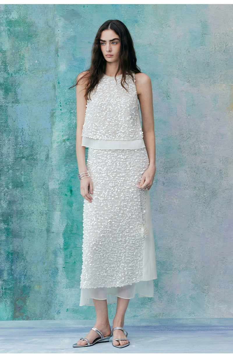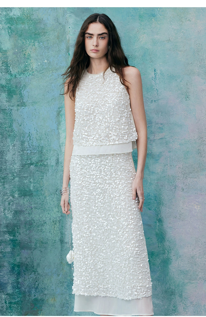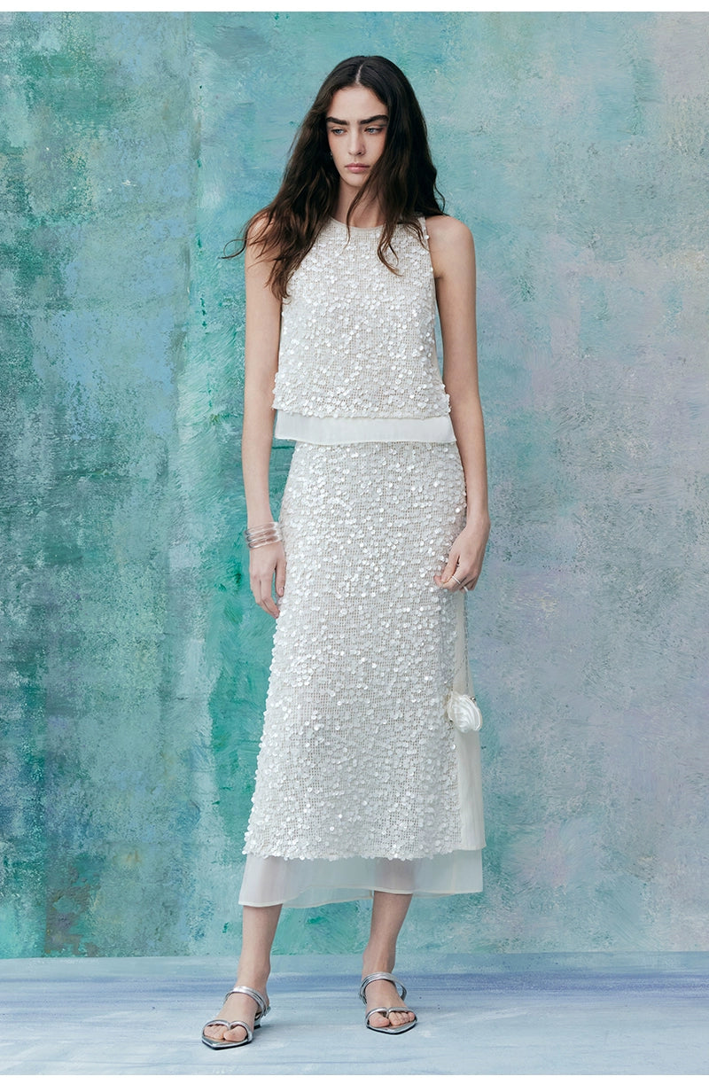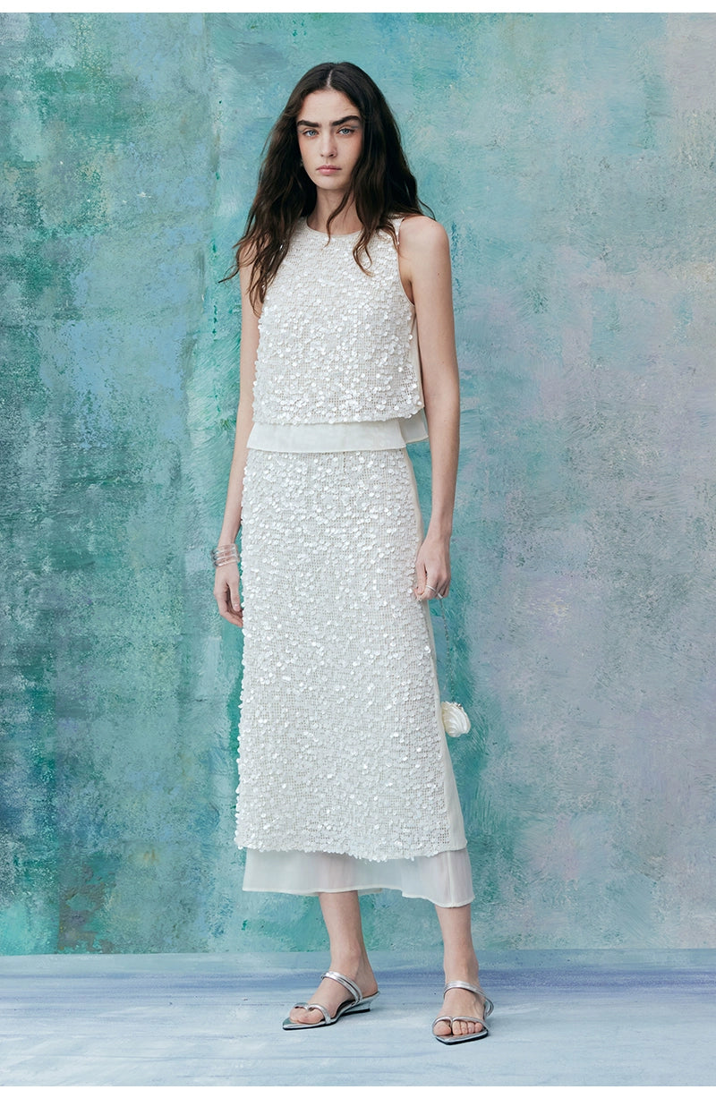 The classic round-neck vest paired with a straight slit skirt accentuates the dignified elegance of women through clean, minimalist lines. Three distinct fabric types are thoughtfully combined, creating a harmonious contrast through their juxtaposition and seamless integration. The front panel is meticulously tailored for precision, while the back features a delicate, lustrous finish. The hemline exhibits dynamic fluidity with rich layering, offering a multi-sensory experience that engages both sight and touch. The intelligent combination of diverse materials ensures versatility and comfort for everyday wear. When worn as a coordinated ensemble, the piece embodies a modern, innovative aesthetic, exuding a uniquely refined blend of elegance and casual sophistication.