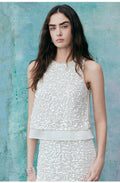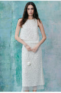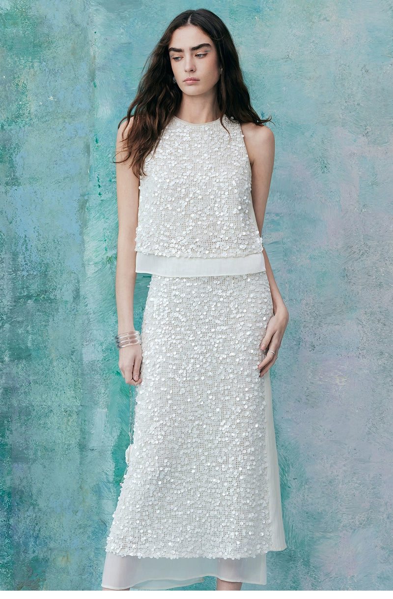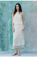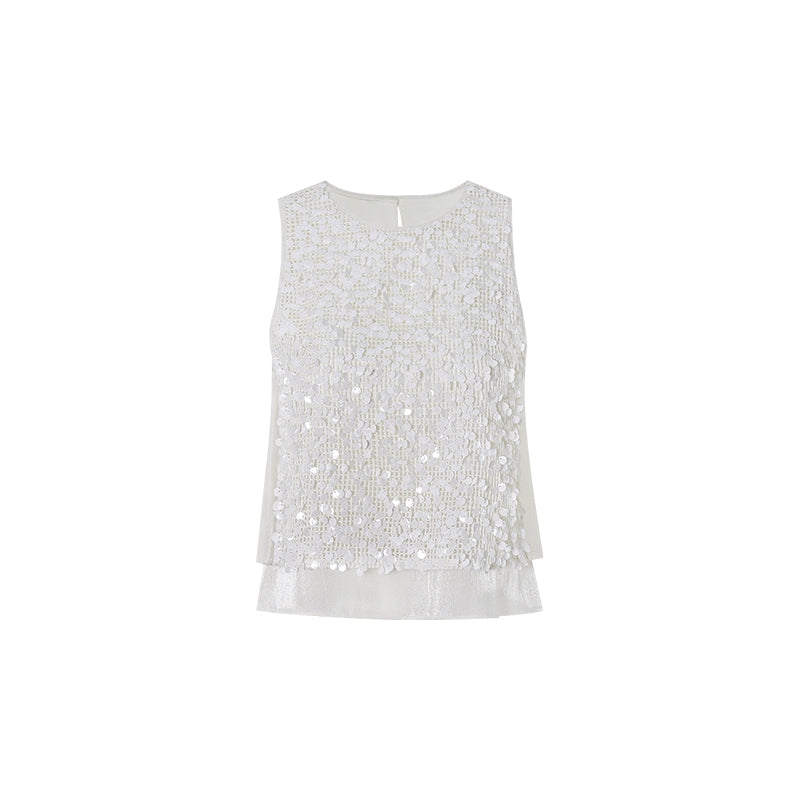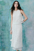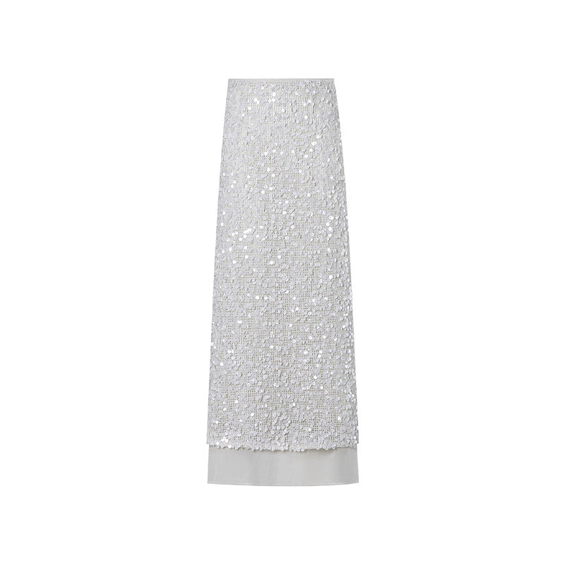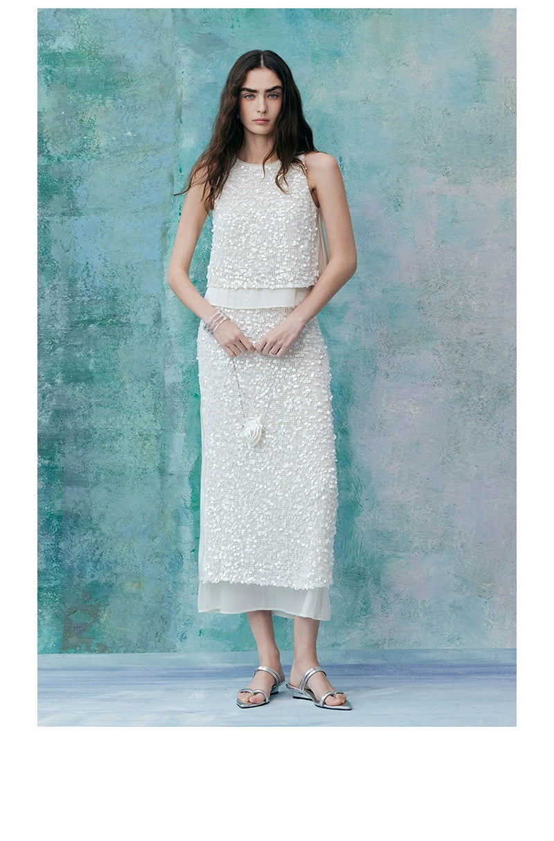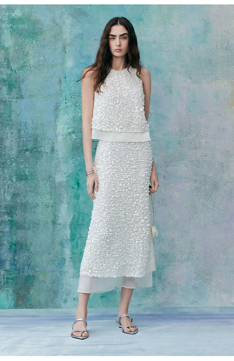 The classic round-neck vest paired with a straight slit skirt accentuates the dignified elegance of women through clean, minimalist lines. Three distinct fabric types are thoughtfully combined, creating a harmonious contrast through their juxtaposition and seamless integration. The front panel is meticulously tailored for precision, while the back features a delicate, lustrous finish. The hemline exhibits dynamic fluidity with rich layering, offering a multi-sensory experience that engages both sight and touch. The intelligent combination of diverse materials ensures versatility and comfort for everyday wear. When worn as a coordinated ensemble, the piece embodies a modern, innovative aesthetic, exuding a uniquely refined blend of elegance and casual sophistication.