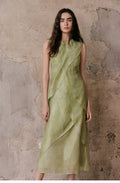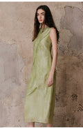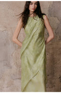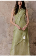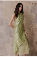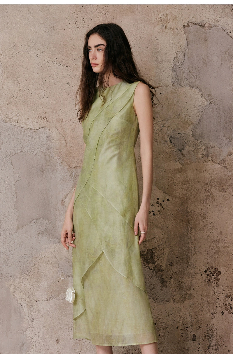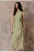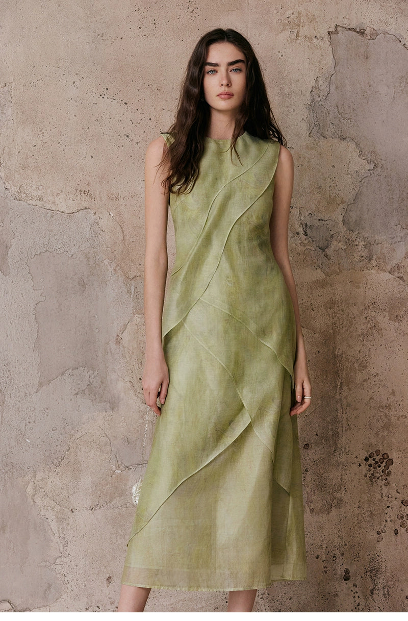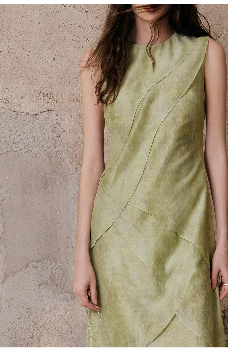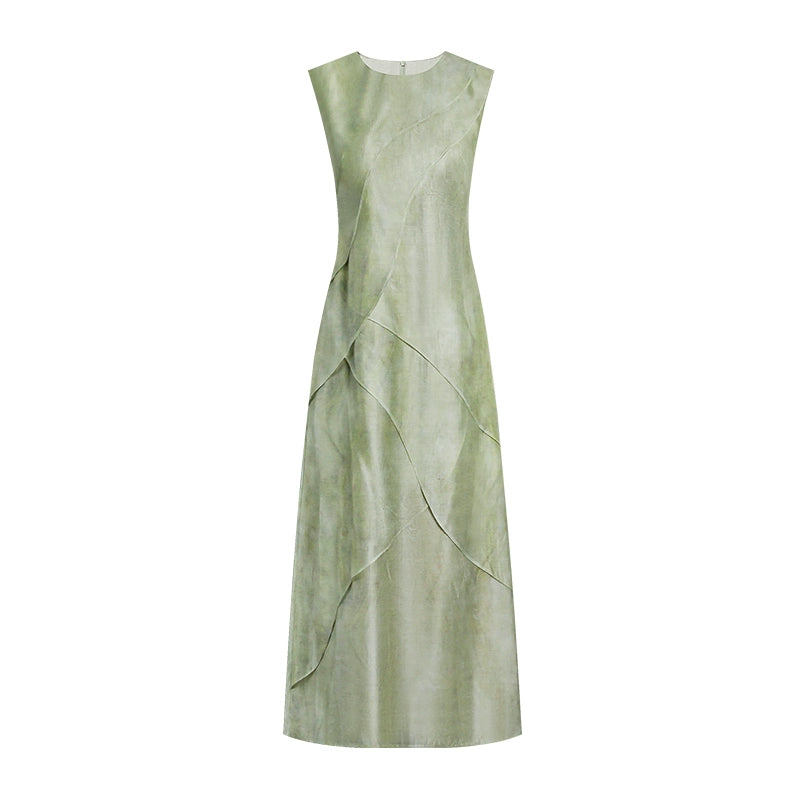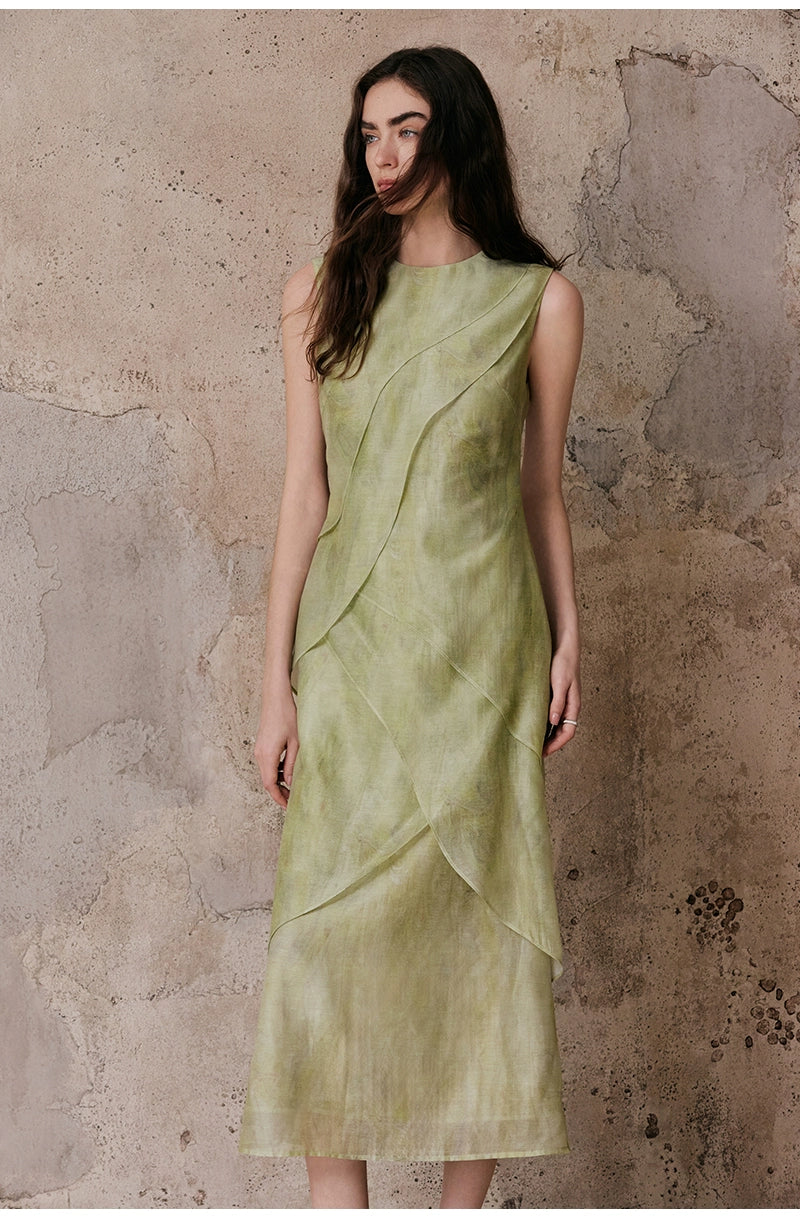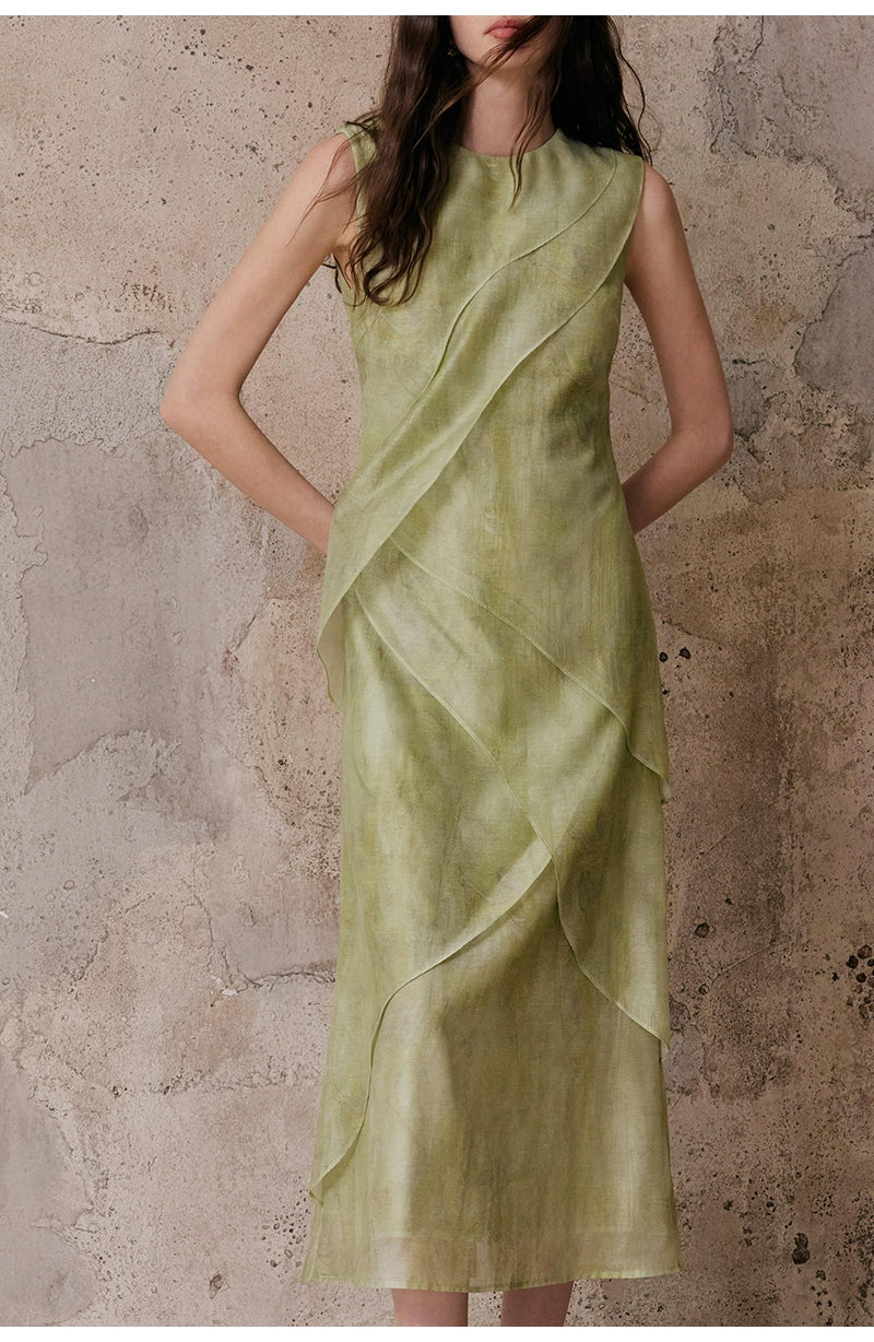 This sleeveless, form-fitting dress features a refined round neckline that accentuates the elegance of the wearer's neck, while the tailored silhouette contours the body with precision. The distinctive layered construction demonstrates thoughtful design: lightweight, textured fabrics are artfully layered to produce irregular, undulating lines reminiscent of rippling water, evoking a soft, romantic ambiance through the interplay of light and shadow.