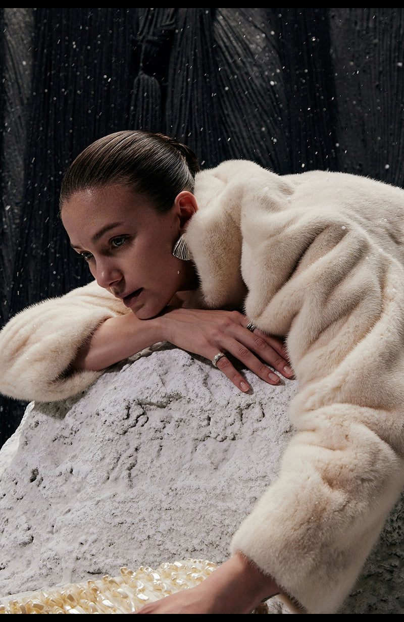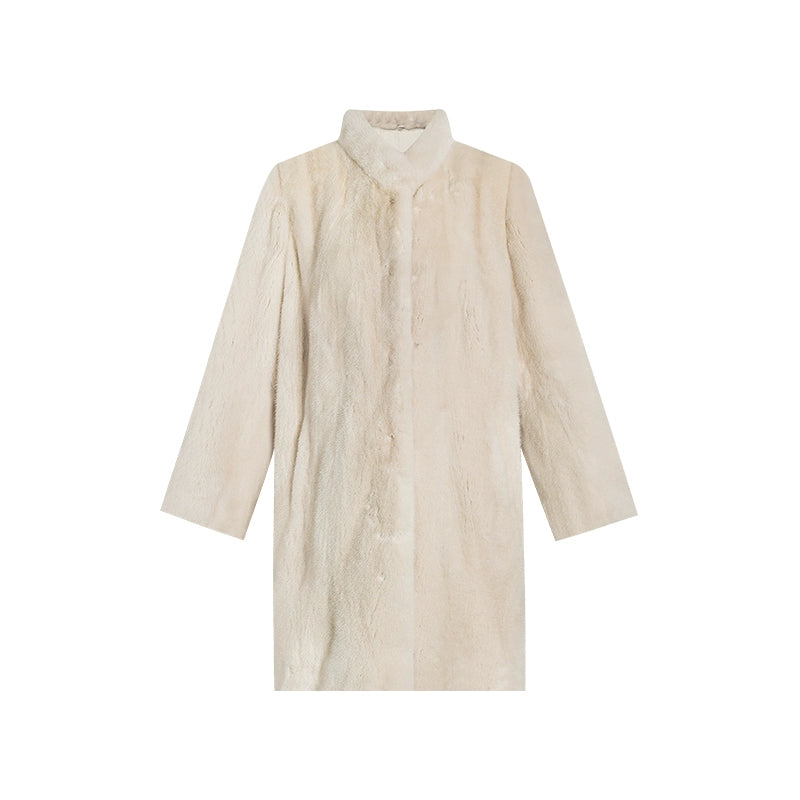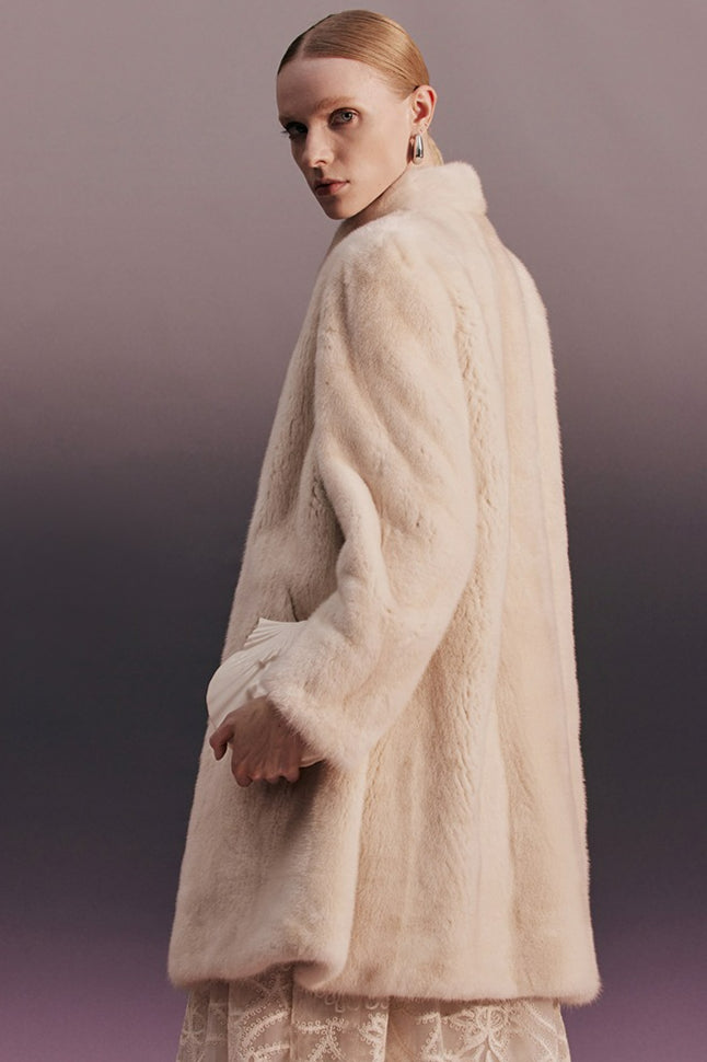 This upgraded classic features a refined stand-up collar and is crafted from long mink fur, showcasing a sleek, elegant silhouette with structured shoulders and an elevated aesthetic. The knee-length garment is composed of luxurious materials that exude sophistication and timeless elegance. Utilizing the full-cut technique—cutting the fur along its natural grain—the design ensures a seamless transition of texture while preserving the inherent qualities of the fur. The garment drapes smoothly, combining fluidity with modern style. The interior lining is meticulously finished with fine needlework, reflecting exceptional craftsmanship and attention to detail.
