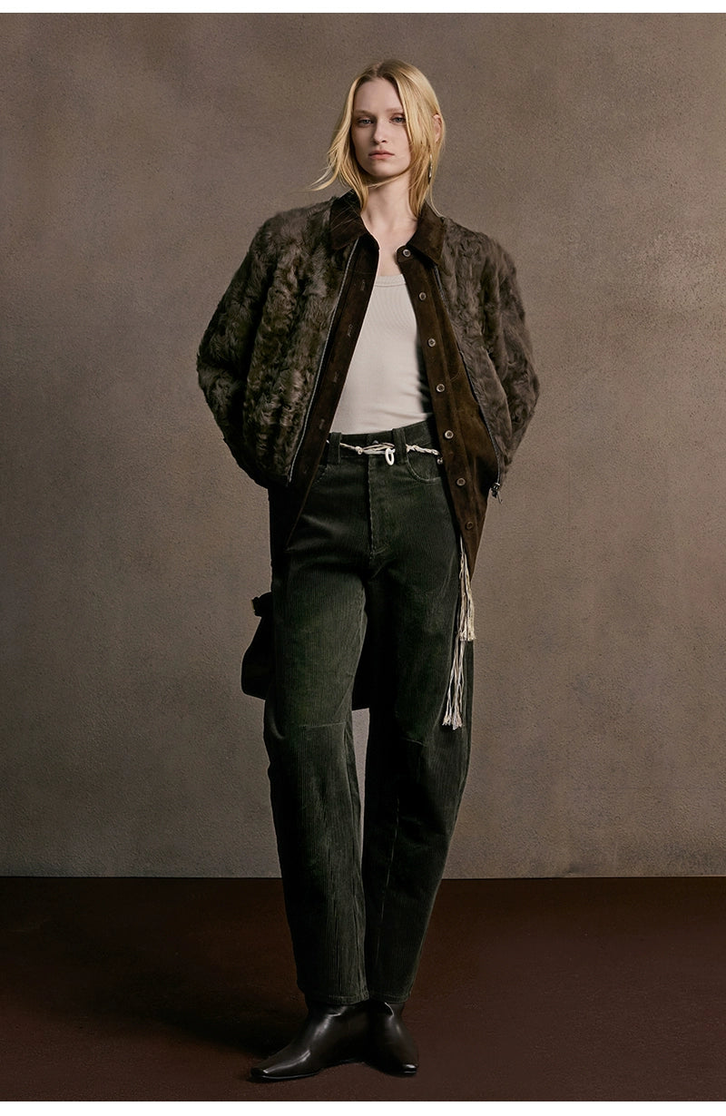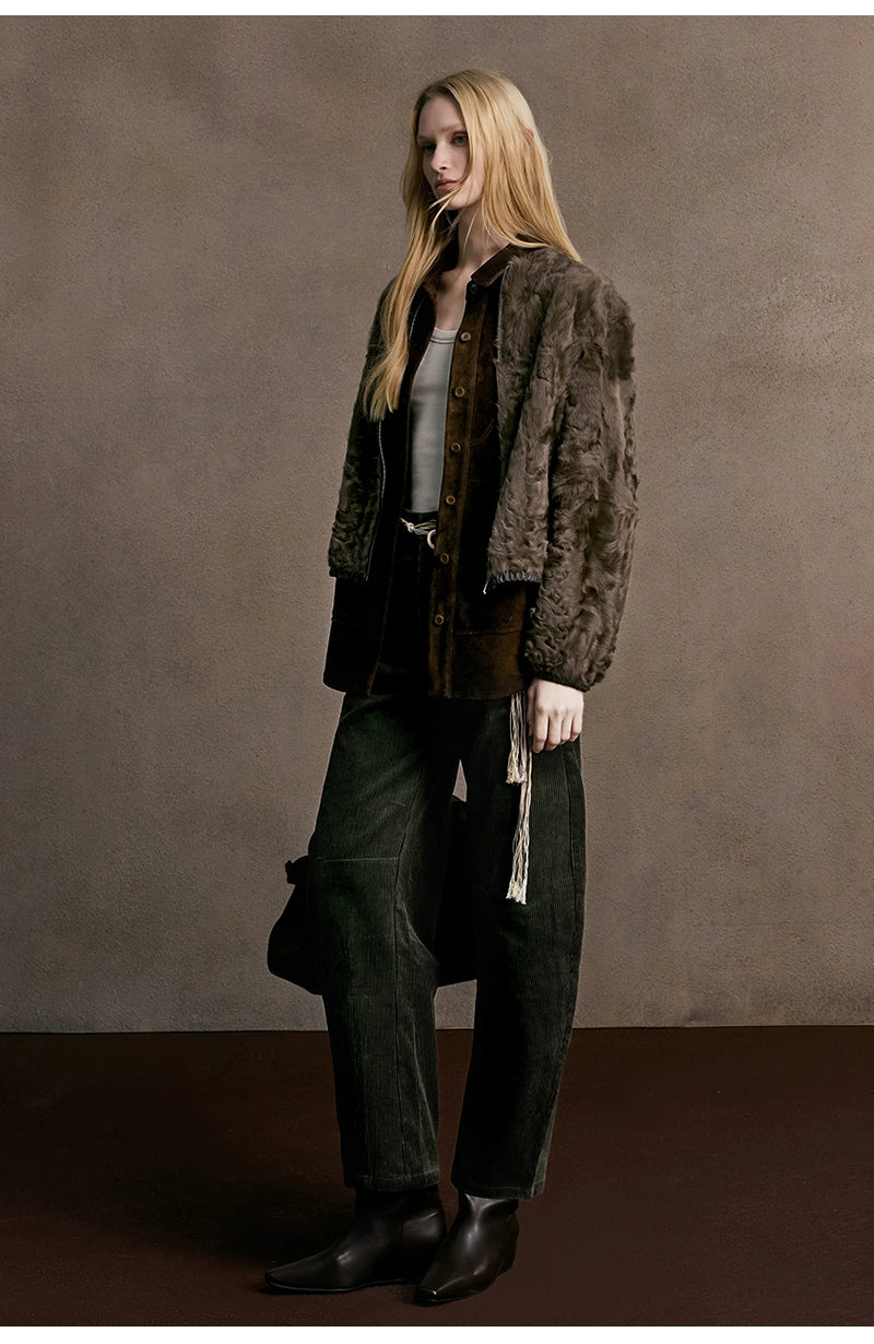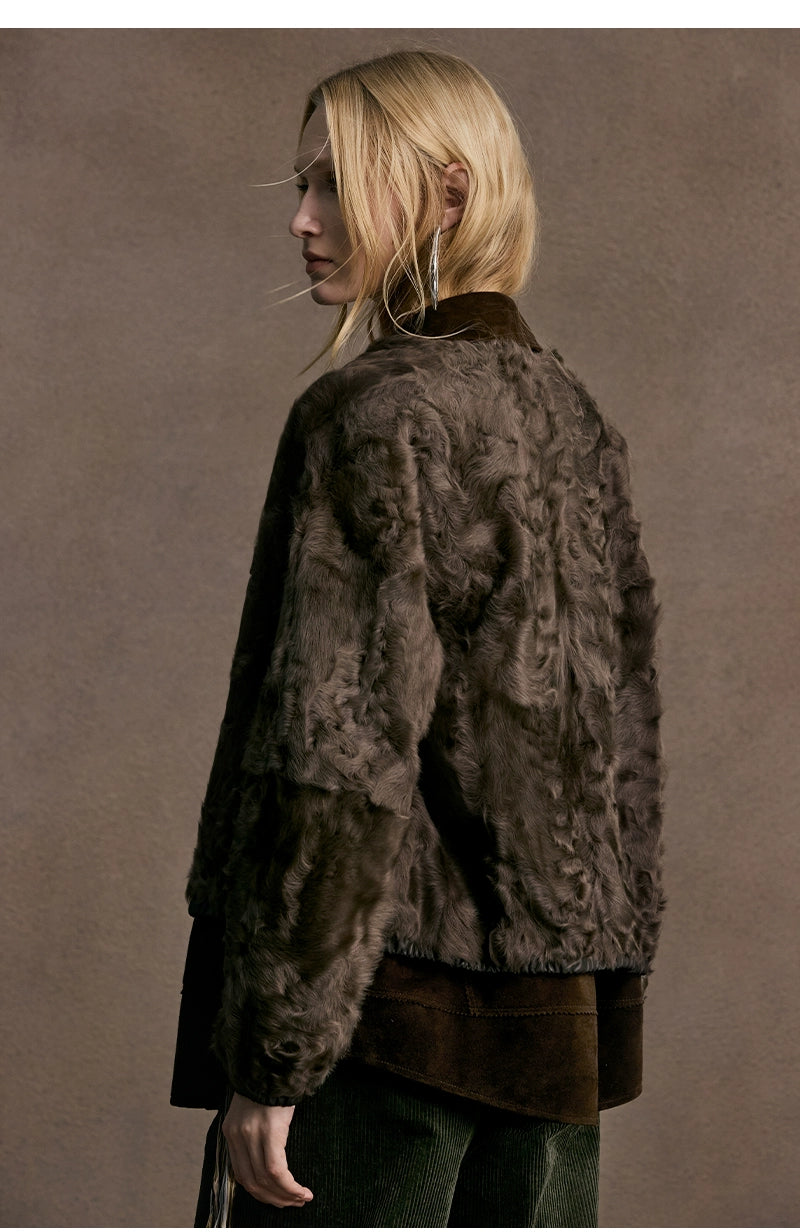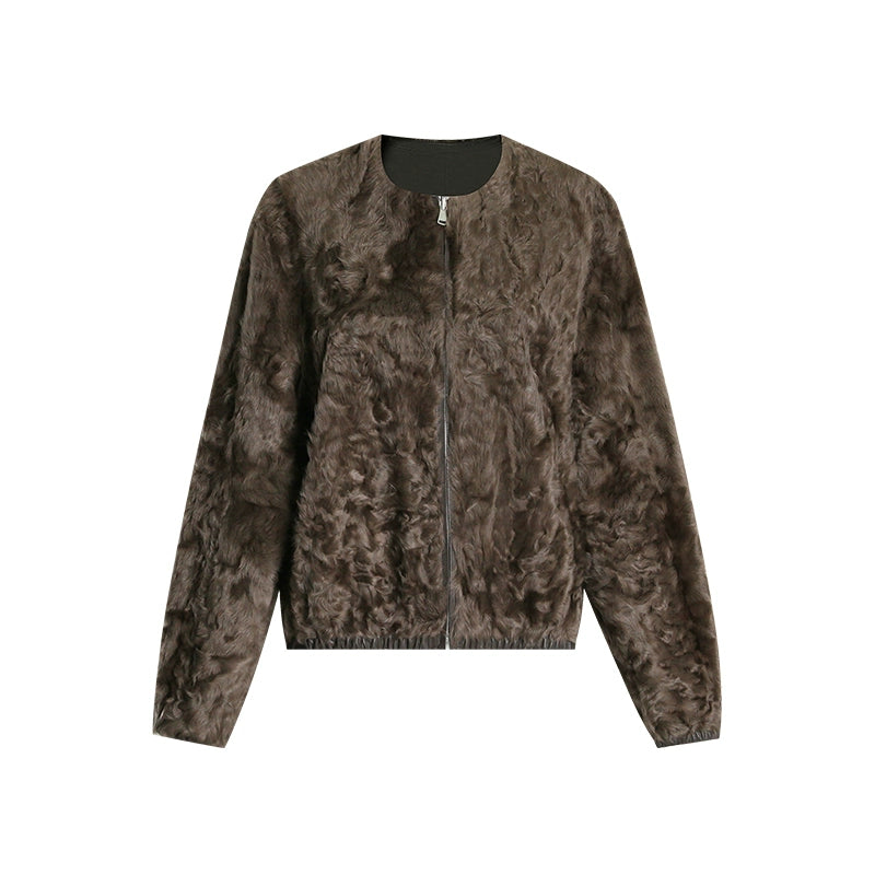 This classic loose-fitting, round-neck coat is designed for versatile layering during autumn and winter, offering a comfortable and universally flattering silhouette. The central front zipper provides functional ease for dressing and undressing, while the side pockets are seamlessly integrated into the wool surface, aligning with minimalist design principles. Elasticated cuffs and a slightly tapered hem ensure a balanced proportion, maintaining a relaxed yet structured outline. Crafted from durable sheepskin and fur, the coat features a naturally curly texture that enhances breathability and adds a refined, effortless aesthetic. When worn, it delivers both warmth and sophistication, making it a stylish and practical choice for cold-weather fashion.