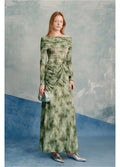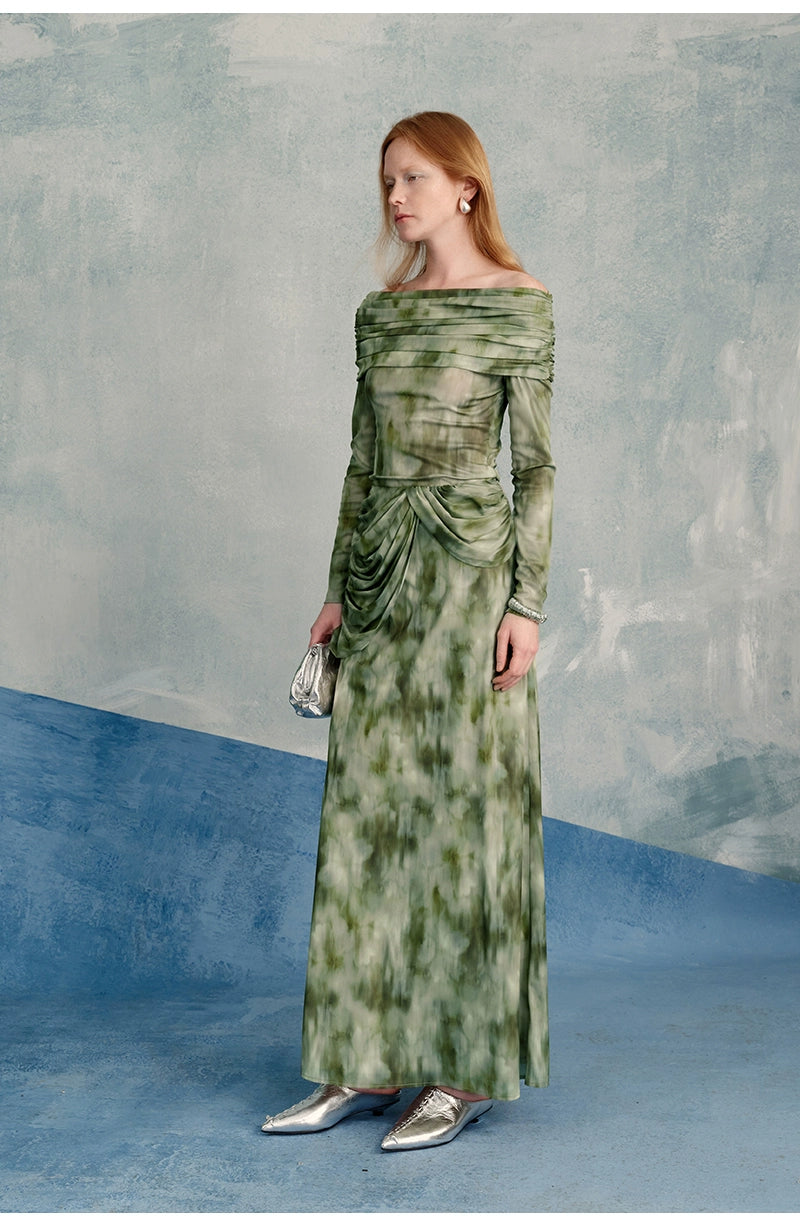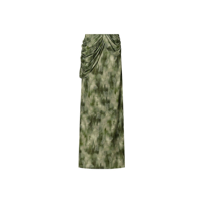 The pleated printed skirt features a three-dimensional waist construction that creates ripple-like layered folds. This architectural cut redefines the contours of the waist and hips, accentuating a graceful figure. The ankle-length hem imparts a fluid, poetic elegance to each step.