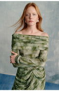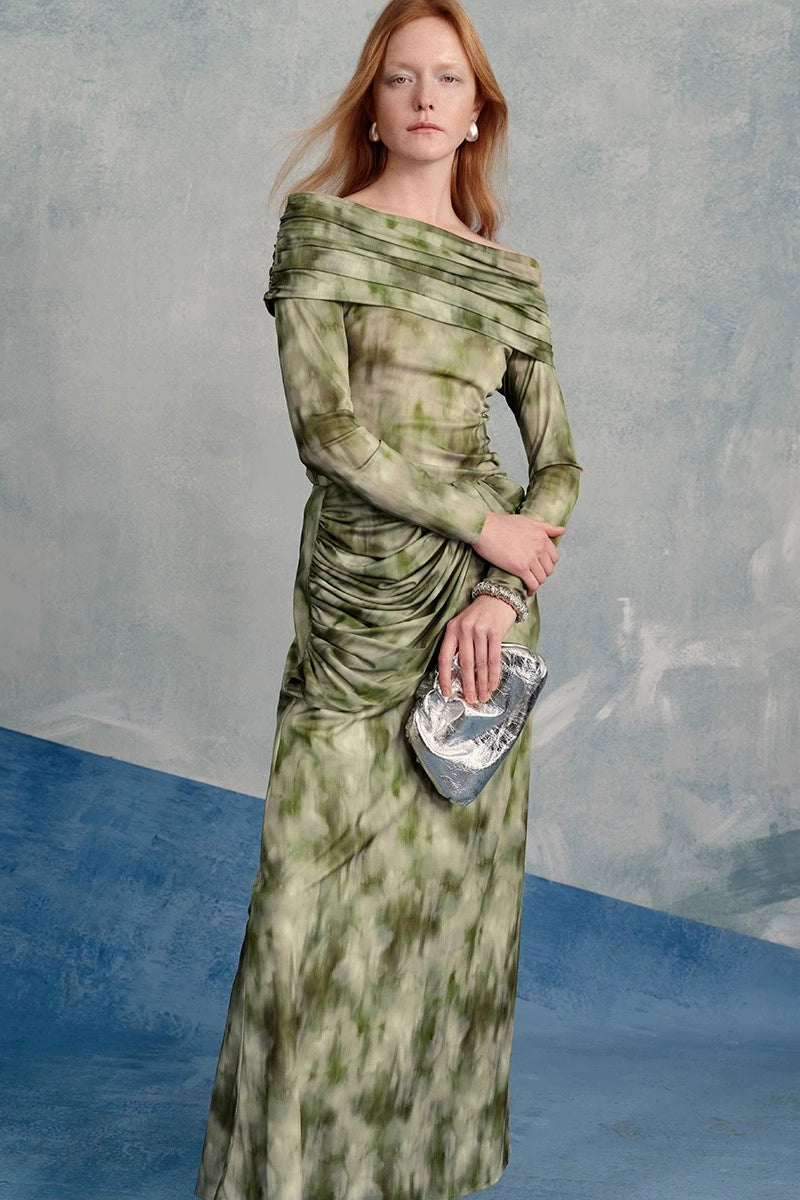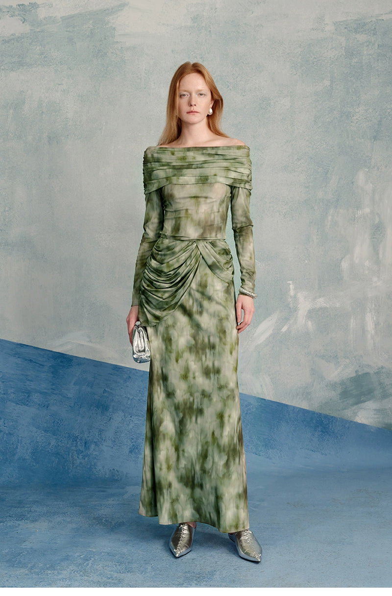 The one-shoulder collar design elegantly highlights the collarbone line. The tailored silhouette, combined with the refined green-toned fabric, complements a fair complexion and enhances the wearer’s poise.