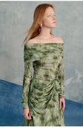 Mesh Off Shoulder Print Top, Pleated Skirt Set