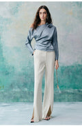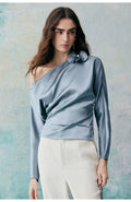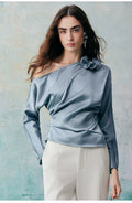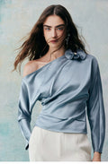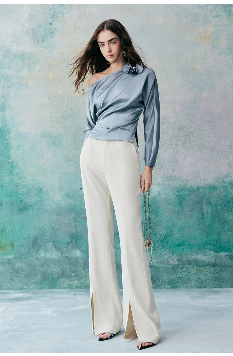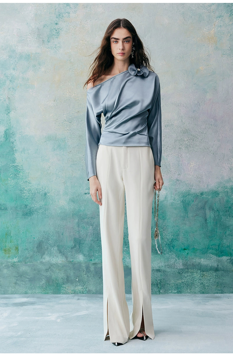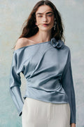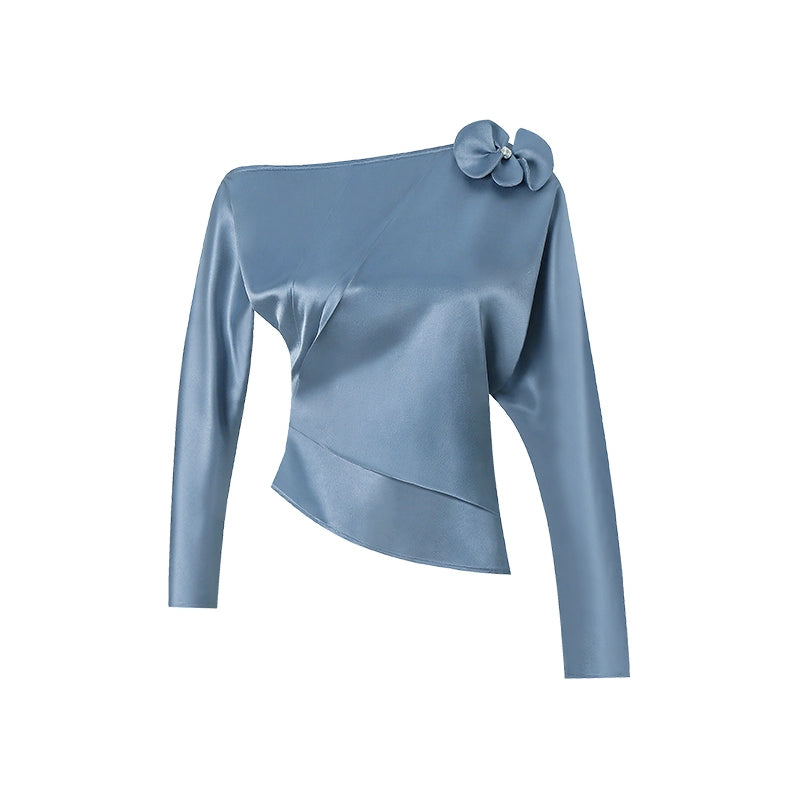 This long-sleeved top features an off-the-shoulder silhouette and a cinched waist, contributing to a well-balanced proportion. The garment's structure employs vertical cutting techniques to achieve deliberate layering and dynamic pleating, enhancing its three-dimensional form. The asymmetrical shoulder design, combined with controlled skin exposure, introduces a visually refreshing aesthetic that aligns with seasonal sensibilities for summer wear. The hemline mirrors the angular articulation of the neckline, establishing a coherent design language across key structural elements. Furthermore, the shoulders are embellished with meticulously crafted, lifelike Phalaenopsis orchid motifs, while the stamens are accentuated with irregularly shaped pearls, which serve to emphasize fine textural contrast and elevate the overall craftsmanship.
