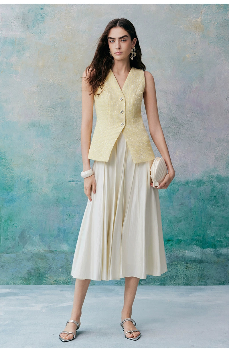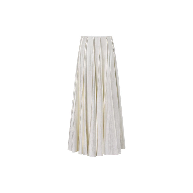 Paired with a pleated skirt, the set becomes a versatile wardrobe staple. Precise pleating creates textured depth, and the skirt moves gracefully, combining elegance with subtle dynamism. The high-waisted A-line shape and sharp pleats express both feminine grace and individuality.