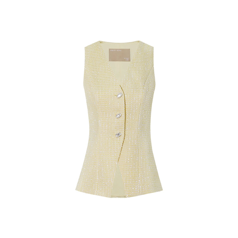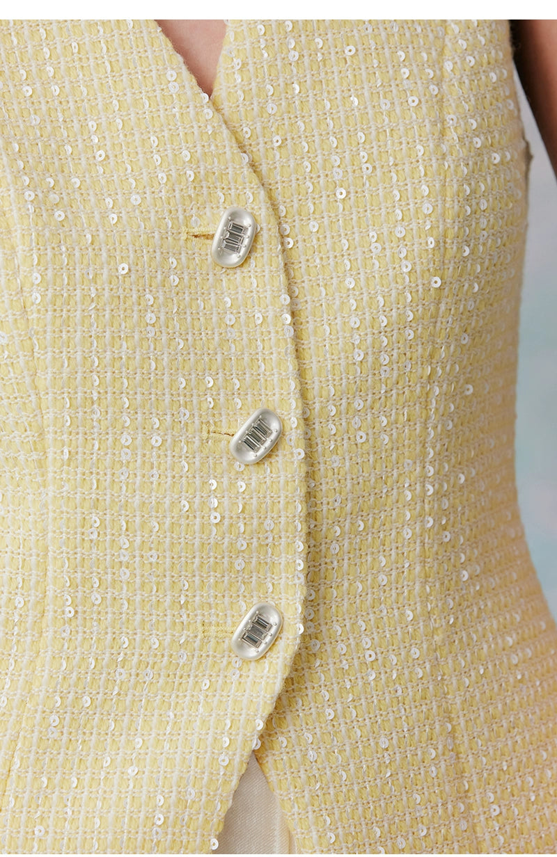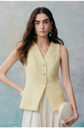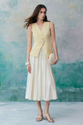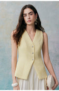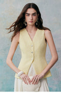 The French-inspired V-neck waistcoat features clean lines and a tailored fit. The V-neck highlights the shoulders and neckline, balancing elegance with presence. A structured waist gently shapes the body while maintaining a smooth silhouette, adding refinement. Custom irregular metal clasps at the front emphasize attention to detail.