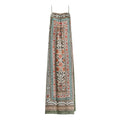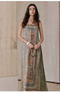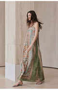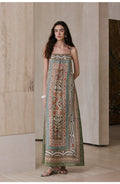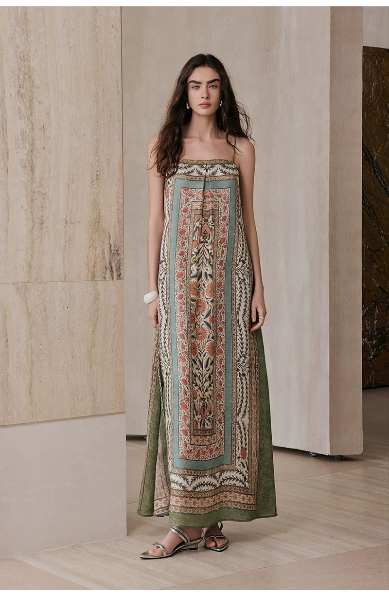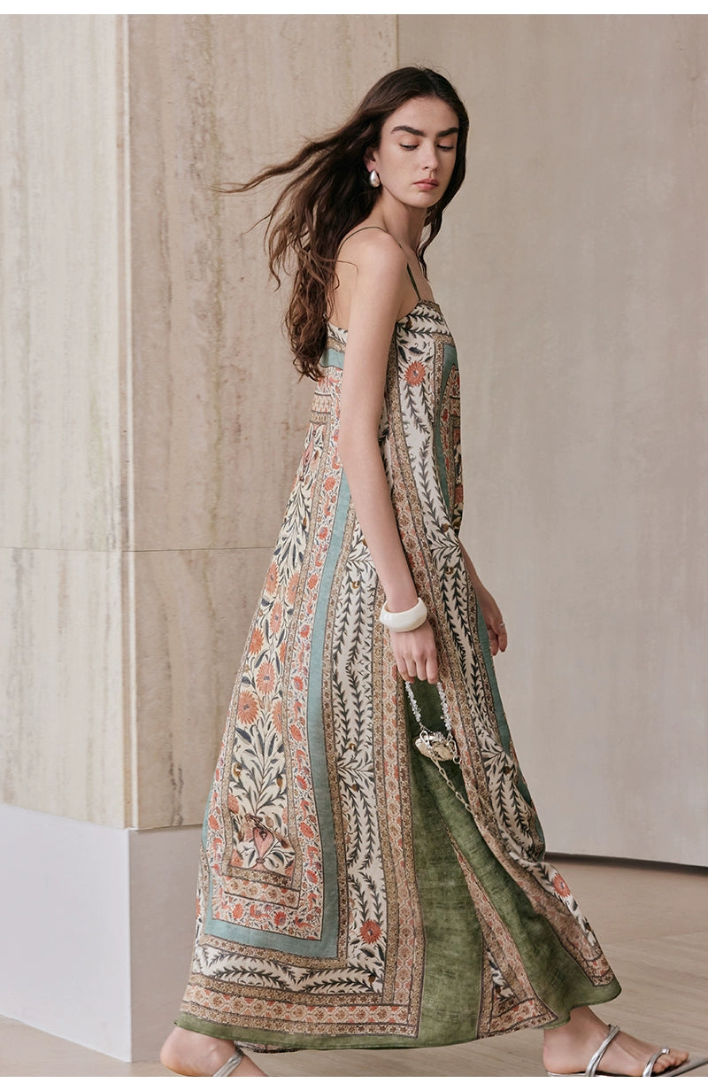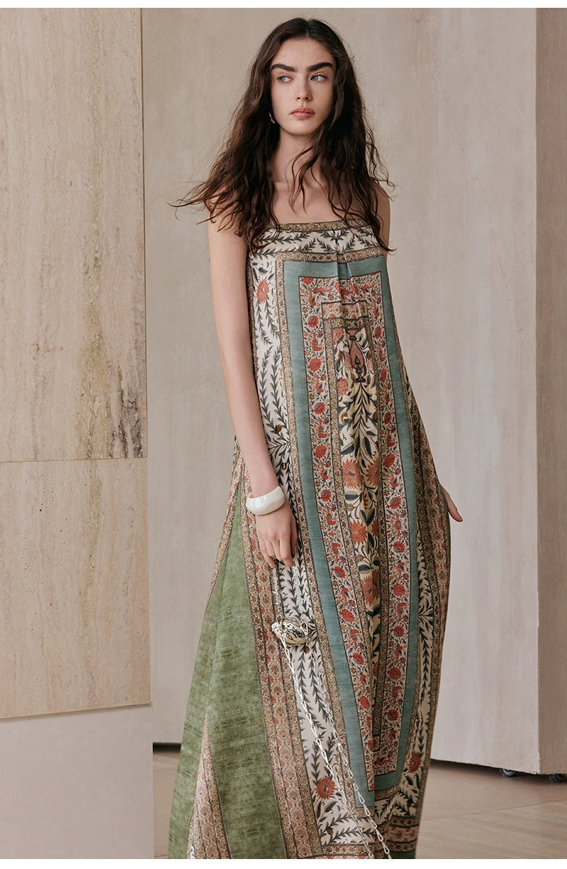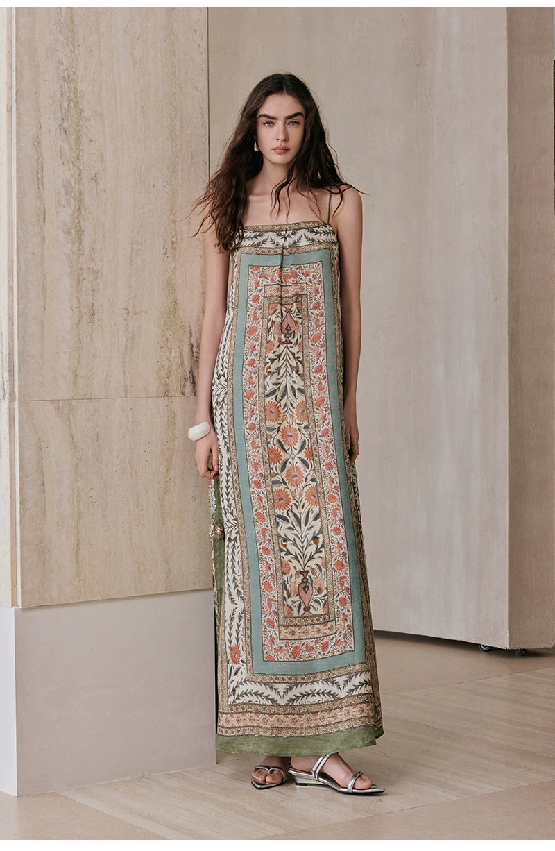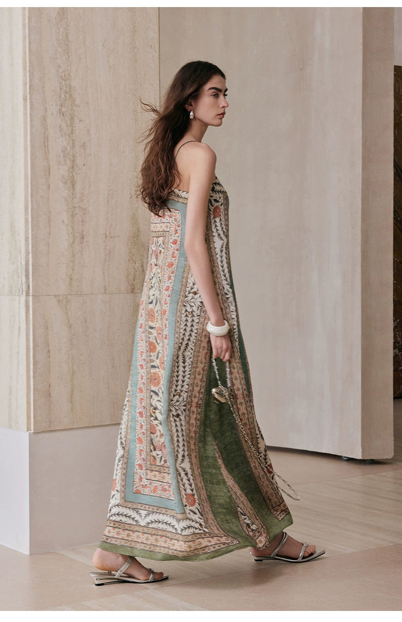 This Bohemian-inspired printed halter dress features slender shoulder straps that create a one-shoulder visual effect through the strategic interplay of pattern placement and cut, thereby elongating the neckline. The print design is derived from three-dimensional sculptural floral motifs found in architectural elements. Symmetrical I-shaped pleating is incorporated to enhance detail articulation, effectively balancing traditional silhouettes with contemporary design aesthetics.